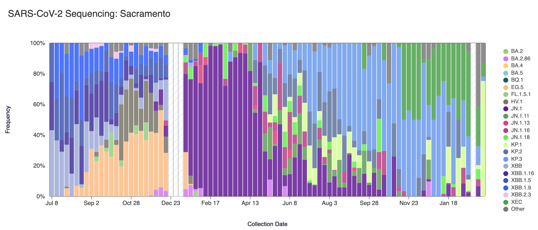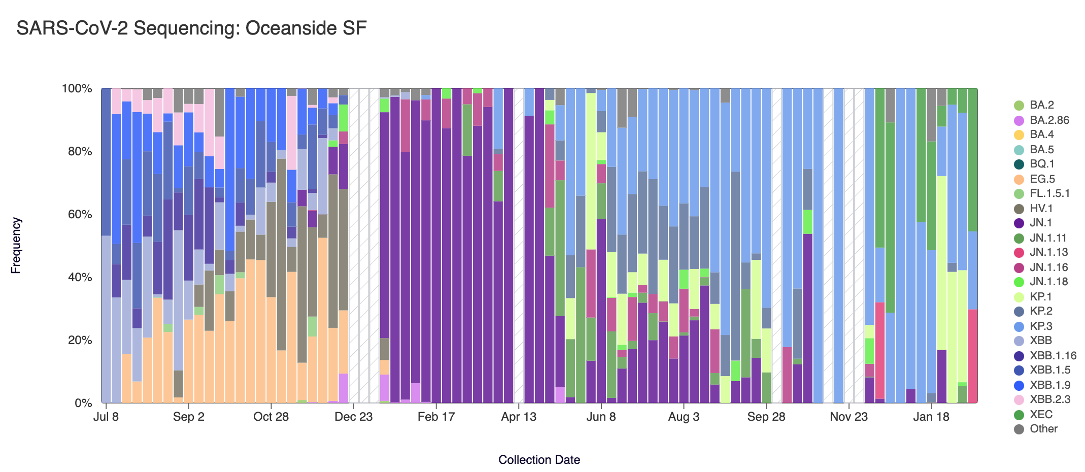 Below are plots from Oceanside SF, Sacramento, San Jose, and Southeast SF showing the relative proportions of different variants inferred from sequencing the entire genome of SARS-CoV-2. White and grey striped bars indicate no data is currently available for that week.