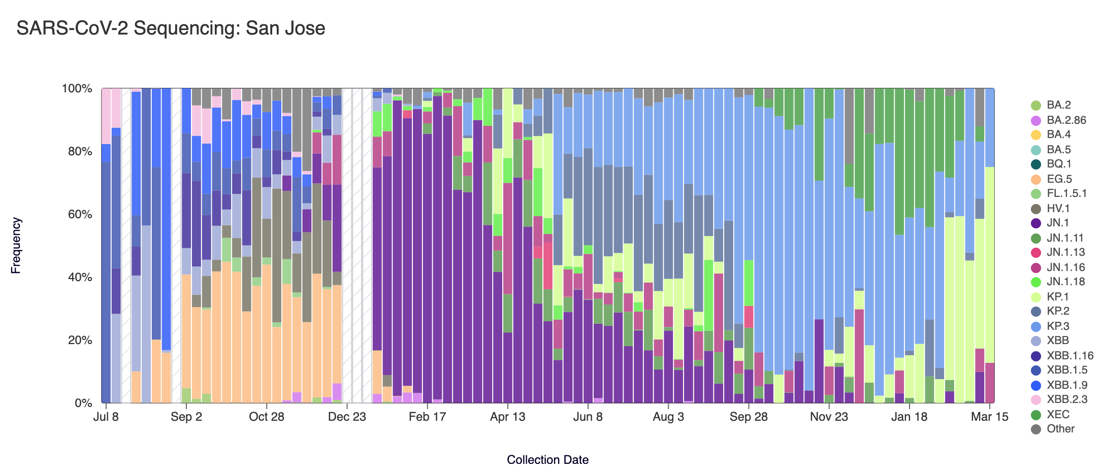 Note that the sequencing data are always from samples taken between 1-2 weeks ago (in this case, Mar 15, 2025). In the most recent samples, KP.1 (in lime green) made up the largest proportion of lineages detected at San Jose (62.2%). Since the week of March 08, 2025, both Sacramento and Southeast SF have had coverage below the default freyja threshold of 60% to run analysis. Since the week of February 15, 2025, Oceanside SF samples have had coverage below the default freyja threshold of 60% to run analysis.