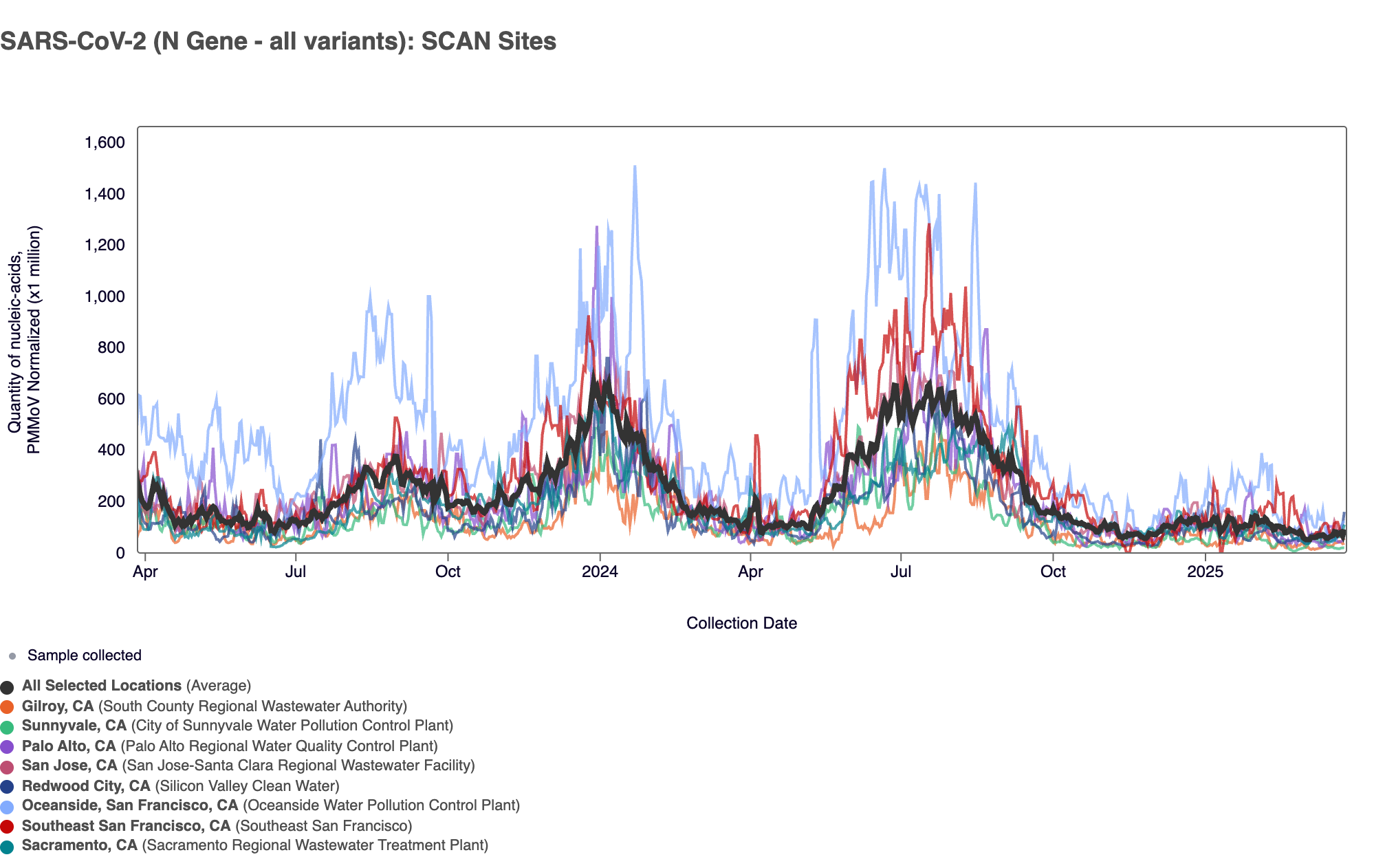Below are all the data from all the SCAN plants for the last two years. You can access the graph here. The population weighted average across the SCAN plants is shown in black. The population weighted average has plateaued since Dec 2024.
