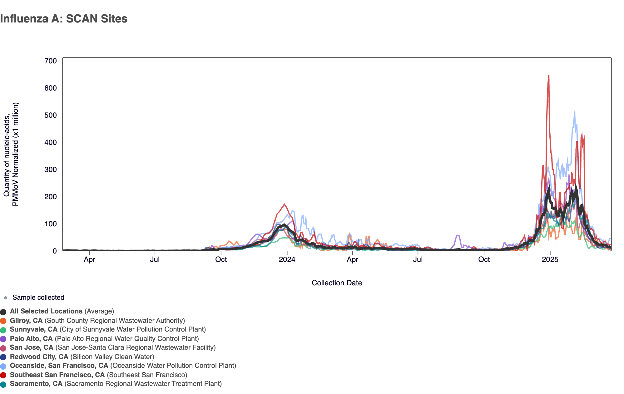 Influenza A (IAV) RNA was detected in 97% of samples in the past 3 weeks. The median IAV RNA concentration across all 8 SCAN sites in the last 3 weeks was 12,382 copies per gram. Below are all the IAV data from all the SCAN plants for the last two years. You can access the graph here. The population weighted average across the SCAN plants is shown in black.