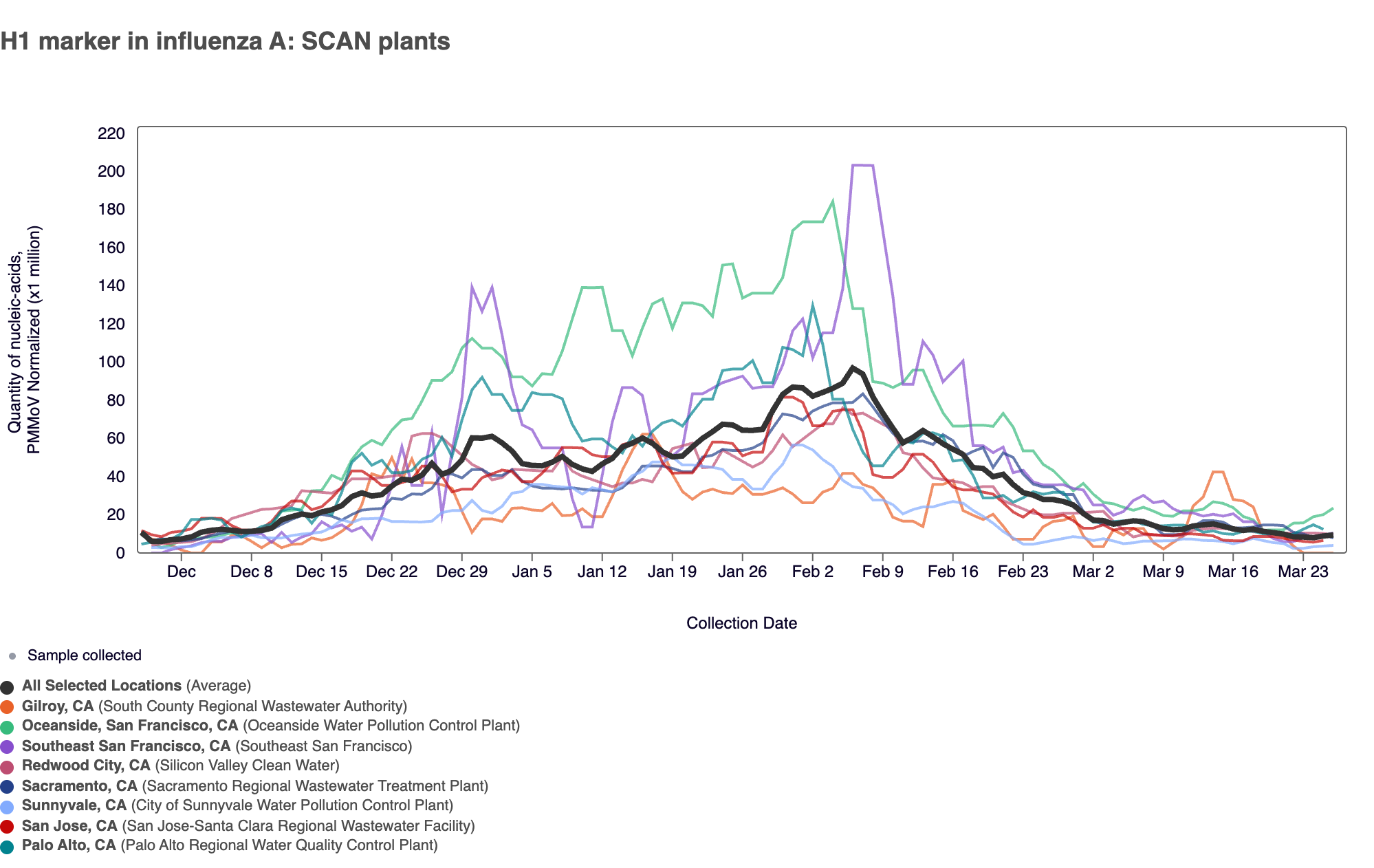 93% of samples in the past 3 weeks have tested positive for the H1 marker in Influenza A. The chart below shows H1 marker data from all the SCAN plants since we resumed the H1 assay at the end of 2024. The population weighted average across the SCAN plants is shown in black. Evident in the plot below are decreasing concentrations of the H1 marker across all 8 SCAN sites.