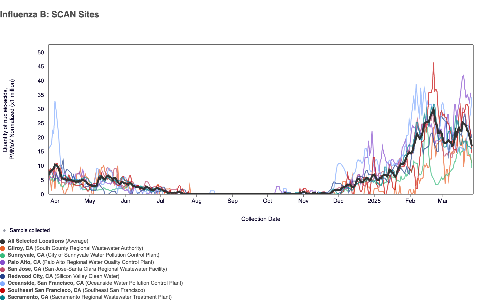 Influenza B (IBV) RNA was detected in ~97% of samples in the past 3 weeks. The median IBV RNA concentration across all 8 SCAN sites in past 3 weeks was 11,590 copies/gram. In the chart below (representing data from the past 1 year), the population weighted average across the SCAN plants is shown in black. You can access the graph here. The recent increase in IBV concentrations across the SCAN sites mirrors what we are seeing at the national level.