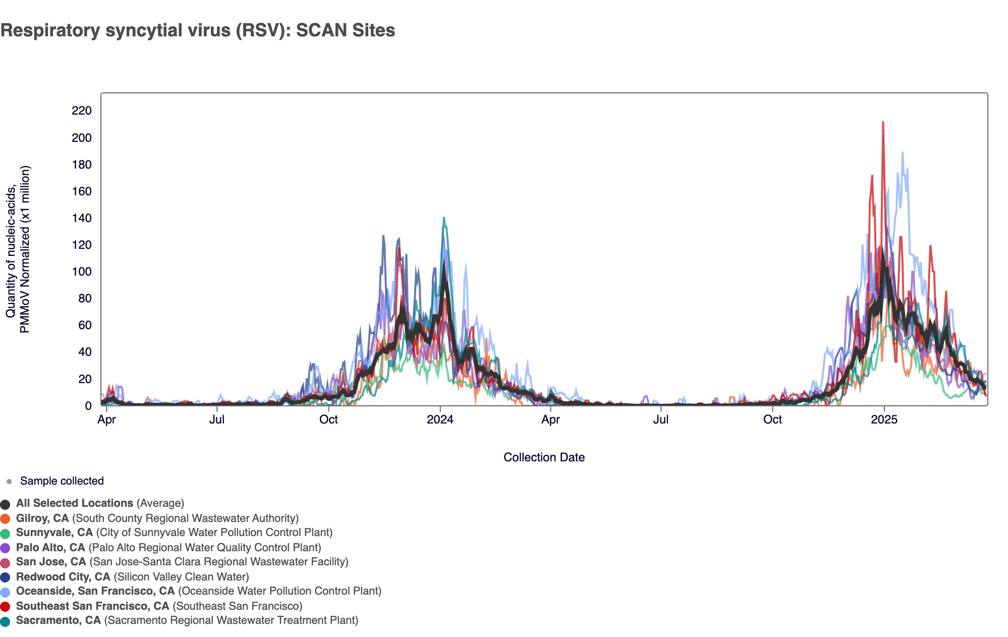 In the chart below (representing data from the past 2 years), the population weighted average line across all the SCAN sites is shown in black, and you can see the current concentrations relative to the peak RSV levels from the end of 2023 going into 2024. The link to the chart below is here if you would like to interact with it.