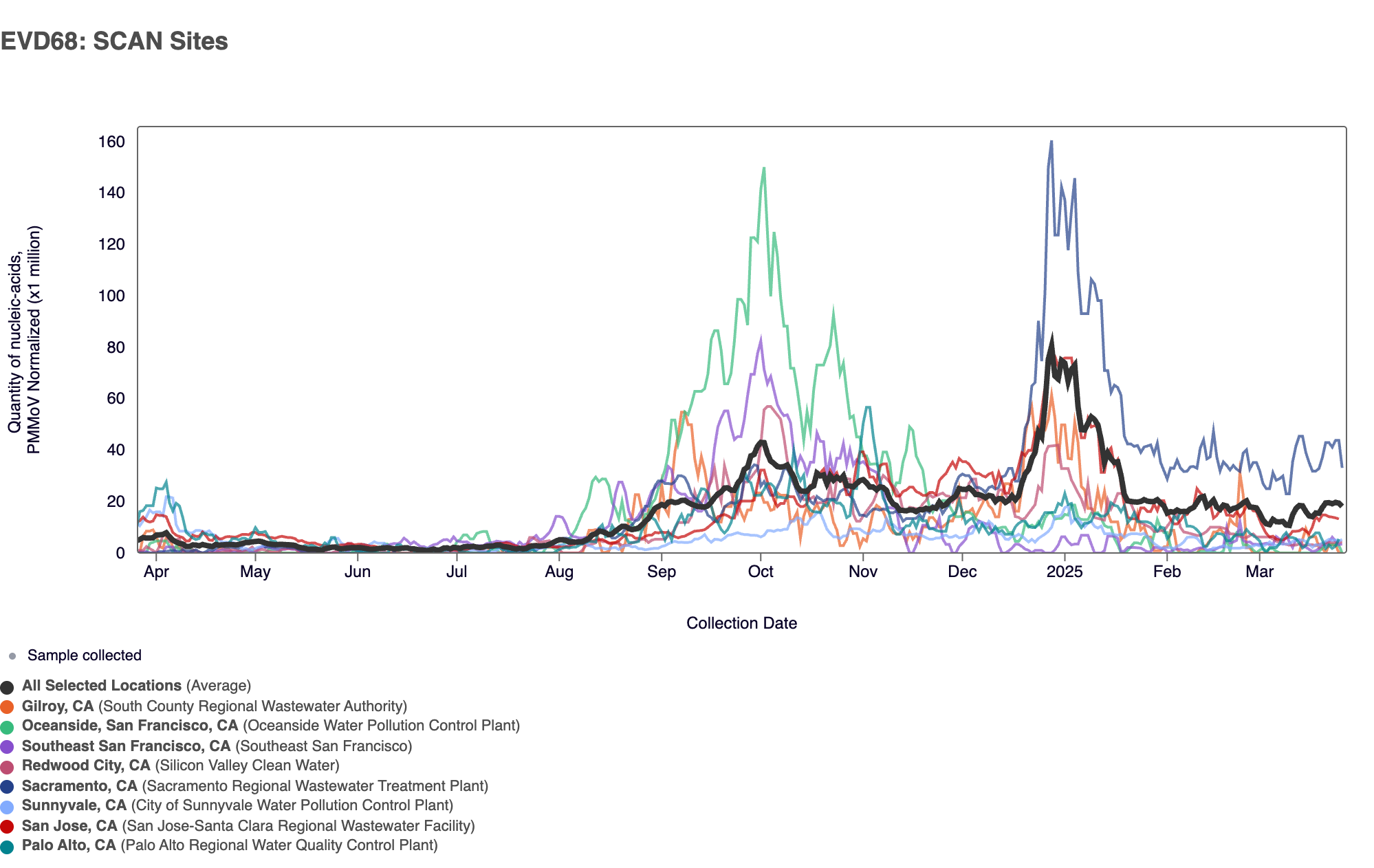In the chart below, the population weighted average line across all the SCAN plants is shown in black over the last 12 months. Evident in the chart were increasing EV-D68 concentrations in early August 2024, concentrations plateauing in early November 2024 to late December 2024. EV-D68 concentrations at SCAN sites have plateaued in recent weeks.