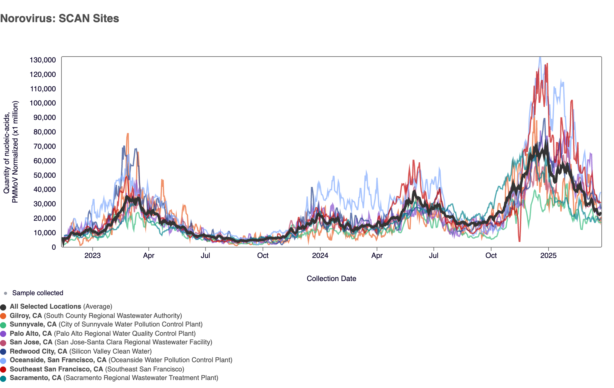 Norovirus GII RNA was detected in 100% of samples from SCAN sites over the last 3 weeks, which is what we are observing across the national WWSCAN sites as well. In the chart below, the population weighted average line across all the SCAN plants is shown in black (since monitoring began in late 2022). Norovirus concentrations remain elevated across all 8 SCAN sites and are still higher than they were this time last year but are decreasing.