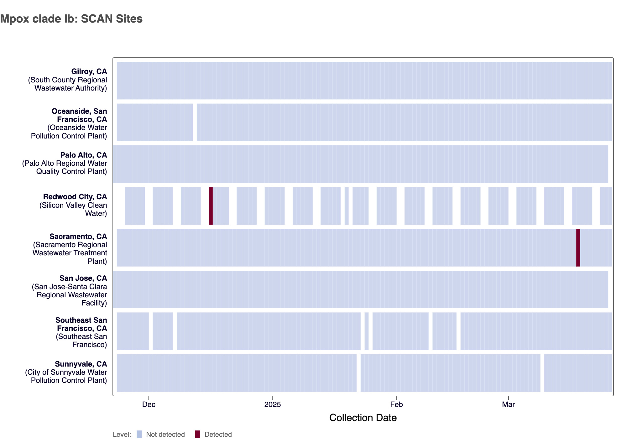 The heat map below shows all the SCAN sites as a row, and each date as a column since late November 2024. The color blue means that Mpox clade Ib DNA was not detected in the sample, and the dark red color means it was detected. White indicates no sample was collected. The chart shows all the data we have collected. You can access the chart here.