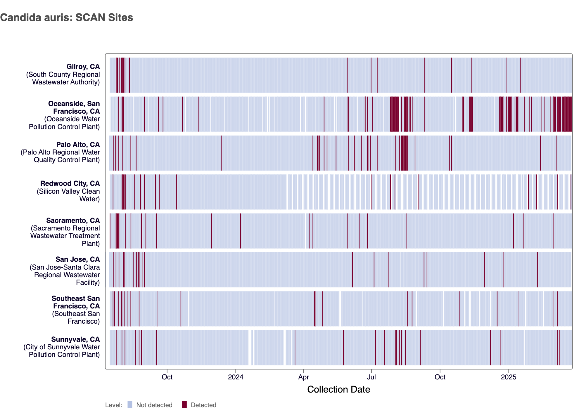 Candida auris DNA was detected at 5 SCAN sites in the last 3 weeks (Oceanside SF, Palo Alto, Southeast SF, SVCW, and Sunnyvale).