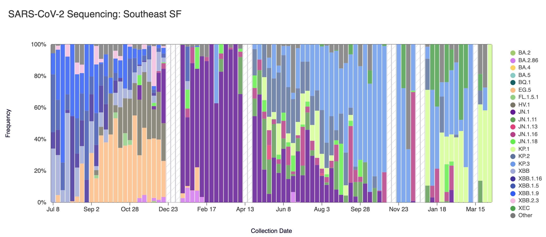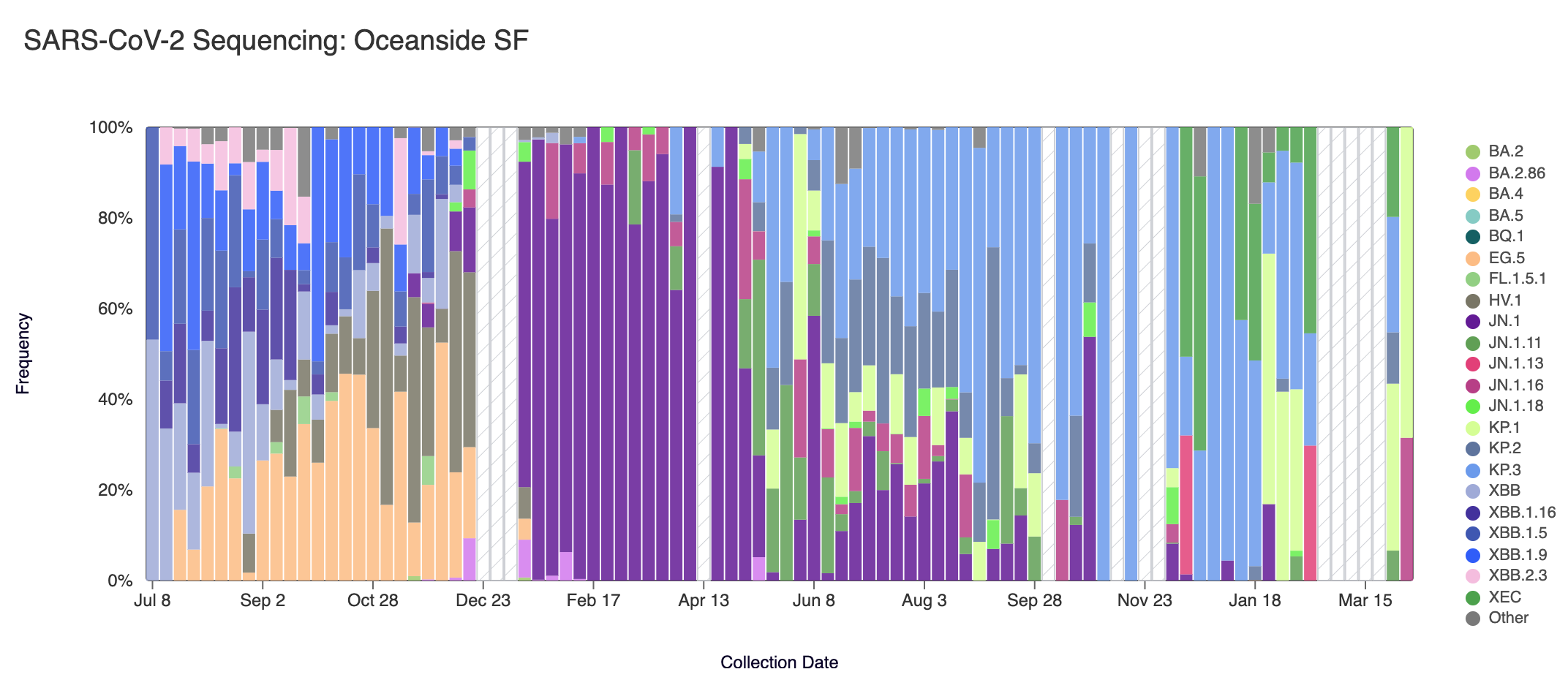 Note that the sequencing data are always from samples taken between 1-2 weeks ago (in this case, April 12, 2025). In the most recent samples, KP.1 (in lime green) made up the largest proportion of lineages detected at Sacramento (100%) and San Jose (36.5%). Since the week of April 05, 2025, Oceanside SF and Southeast SF have had coverage below the default freyja threshold of 60% to run analysis.