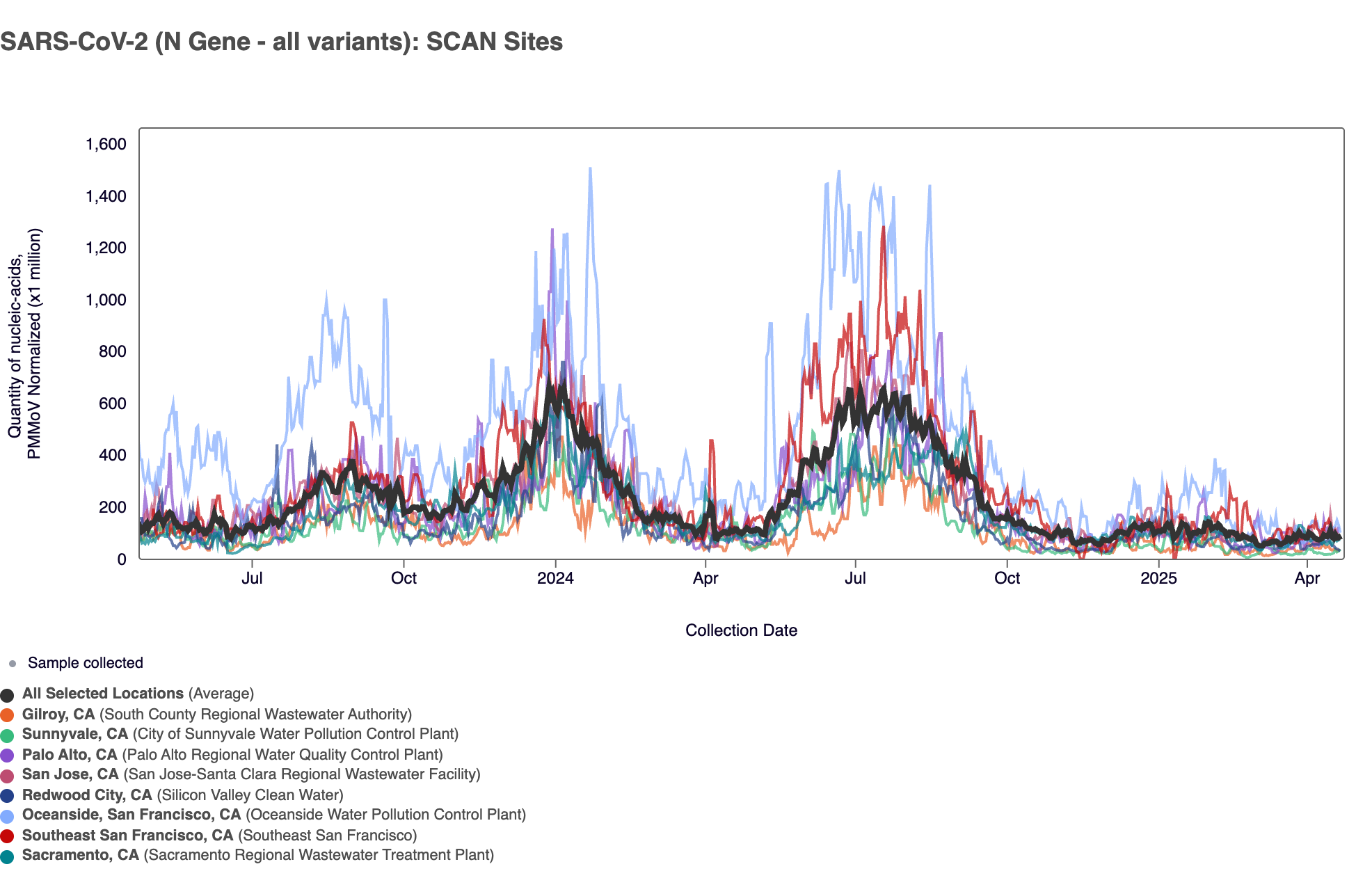 Below are all the data from all the SCAN plants for the last two years. You can access the graph here. The population weighted average across the SCAN plants is shown in black. The population weighted average has remained at a low level since early 2025.