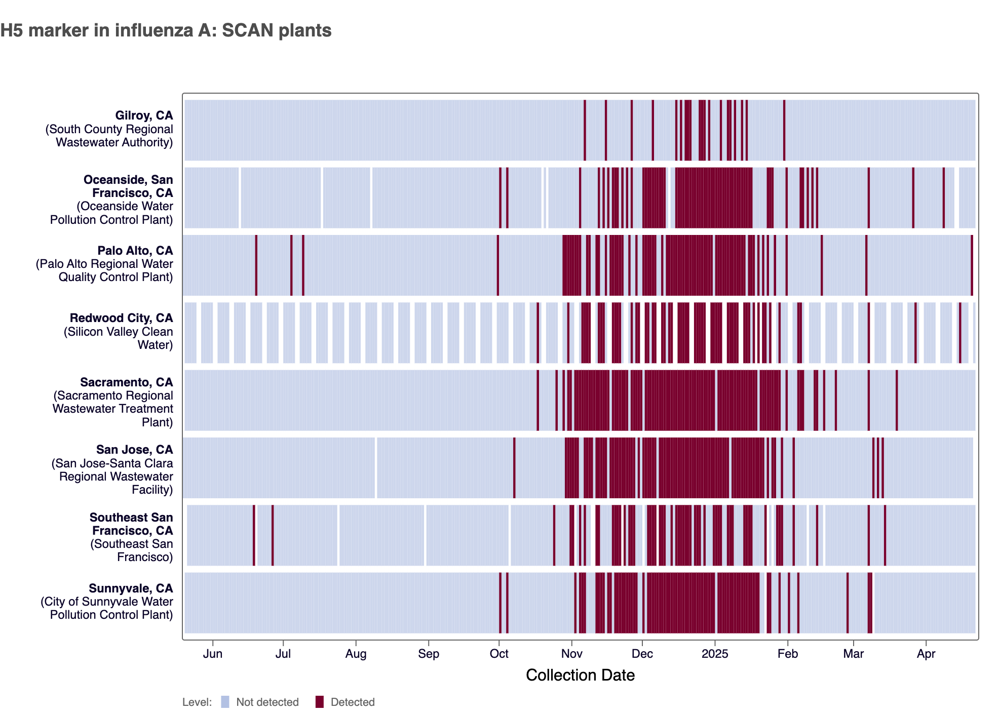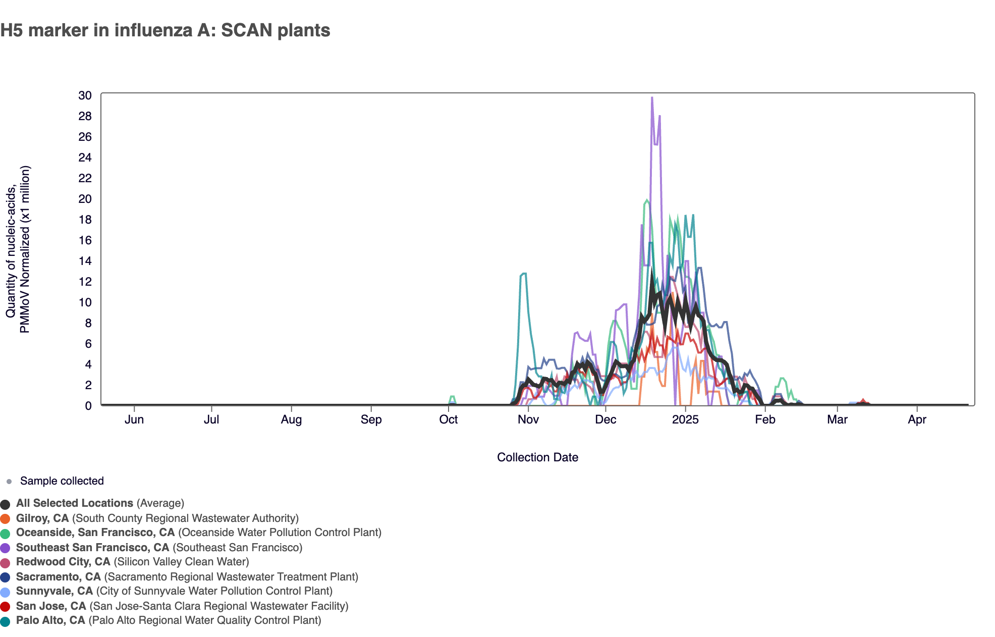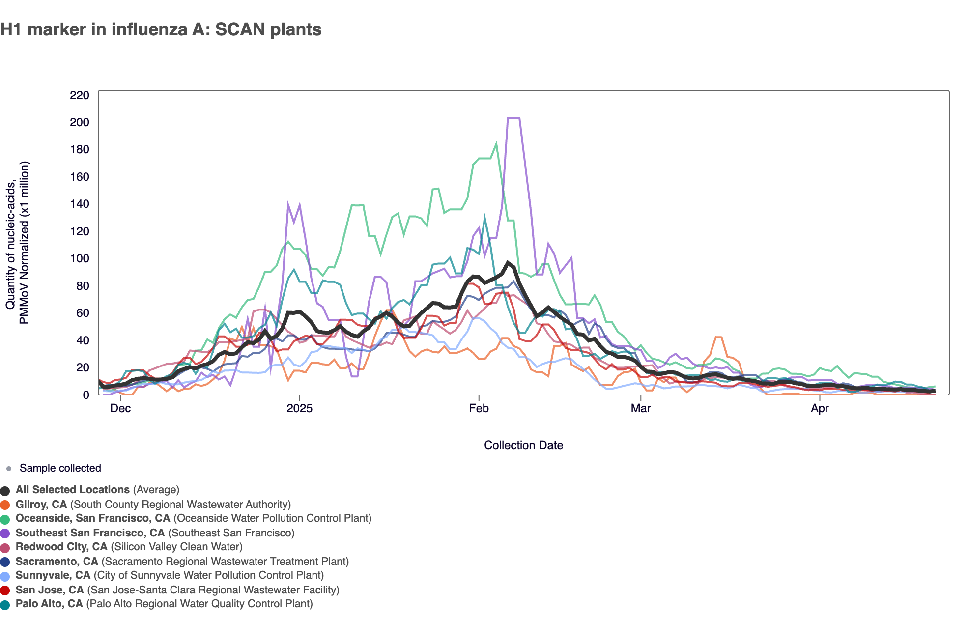 ~81% of samples in the past 3 weeks have tested positive for the H1 marker in Influenza A. The chart below shows H1 marker data from all the SCAN plants since we resumed the H1 assay at the end of 2024. The population weighted average across the SCAN plants is shown in black. Evident in the plot below are decreasing concentrations of the H1 marker across all 8 SCAN sites.