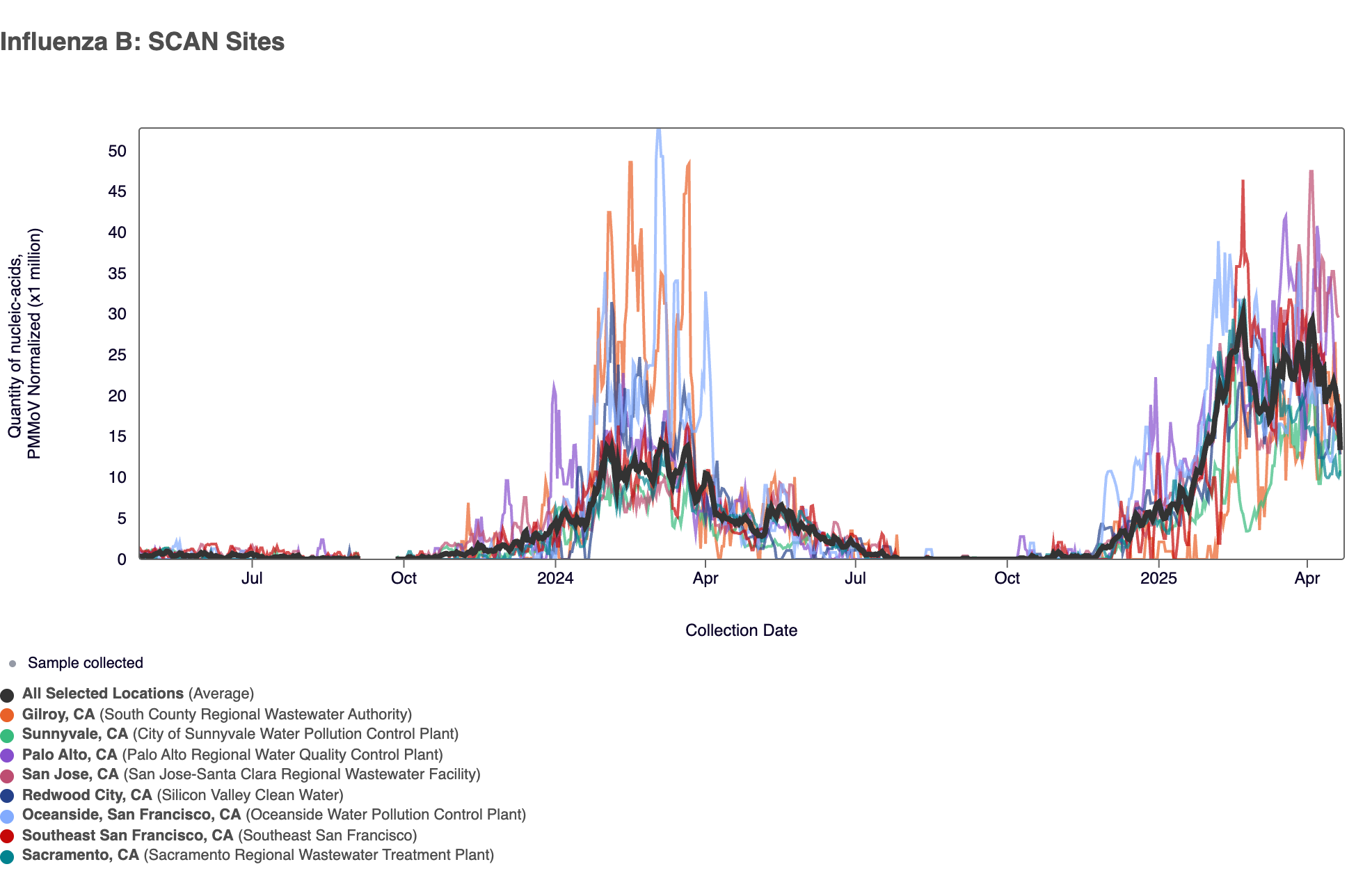 Influenza B (IBV) RNA was detected in ~98% of samples in the past 3 weeks. The median IBV RNA concentration across all 8 SCAN sites in past 3 weeks was 10,198 copies/gram. In the chart below (representing data from the past 2 years), the population weighted average across the SCAN plants is shown in black. You can access the graph here. The recent increase in IBV concentrations across the SCAN sites mirrors what we are seeing at the national level.