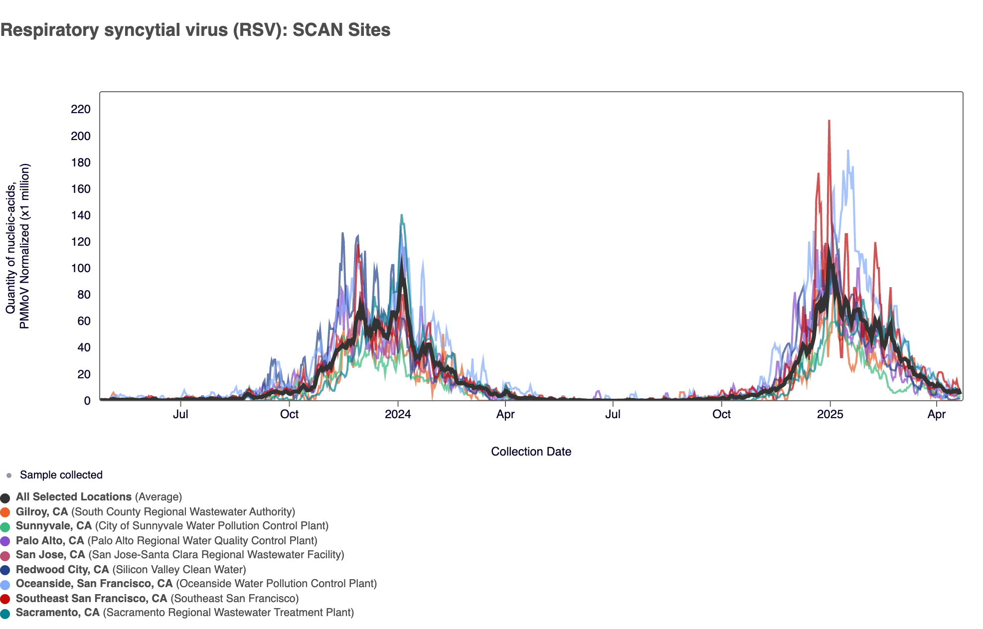 RSV RNA was detected in ~76% of samples in the past 3 weeks. The median RSV RNA concentration across all 8 SCAN sites in the last 3 weeks was 3,774 copies per gram. Currently all 8 SCAN sites are in seasonal onset for RSV in wastewater.