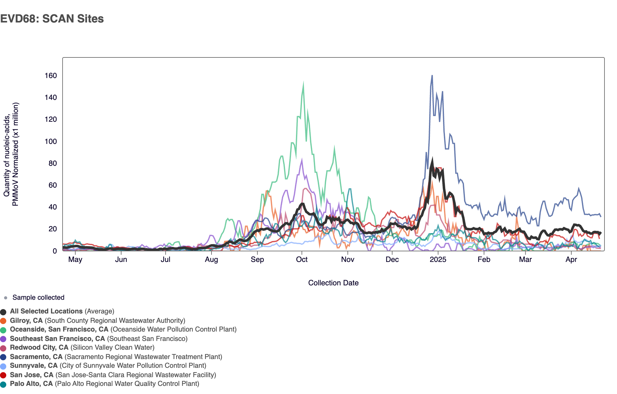 EV-D68 RNA was detected in ~82% of samples collected at all 8 SCAN sites in the last 3 weeks. The median EV-D68 RNA concentration across all 8 SCAN sites in the last 3 weeks was 3,765 copies per gram. Across the national WWSCAN network only a handful of sites are still in seasonal onset for EV-D68 with all of these sites being in the Bay Area and Central Valley in California.
