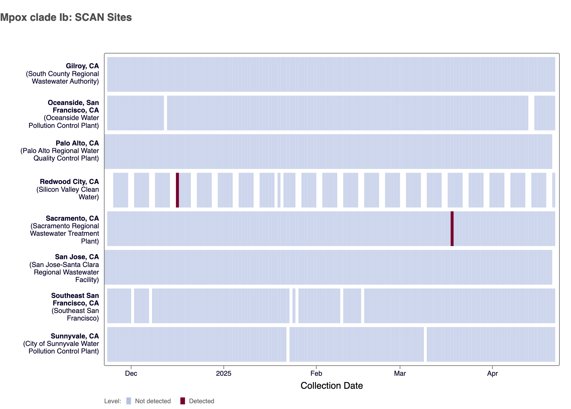Mpox clade Ib DNA was not detected in any samples from the last 3 weeks. Currently all SCAN sites are in the LOW category for Mpox clade Ib.