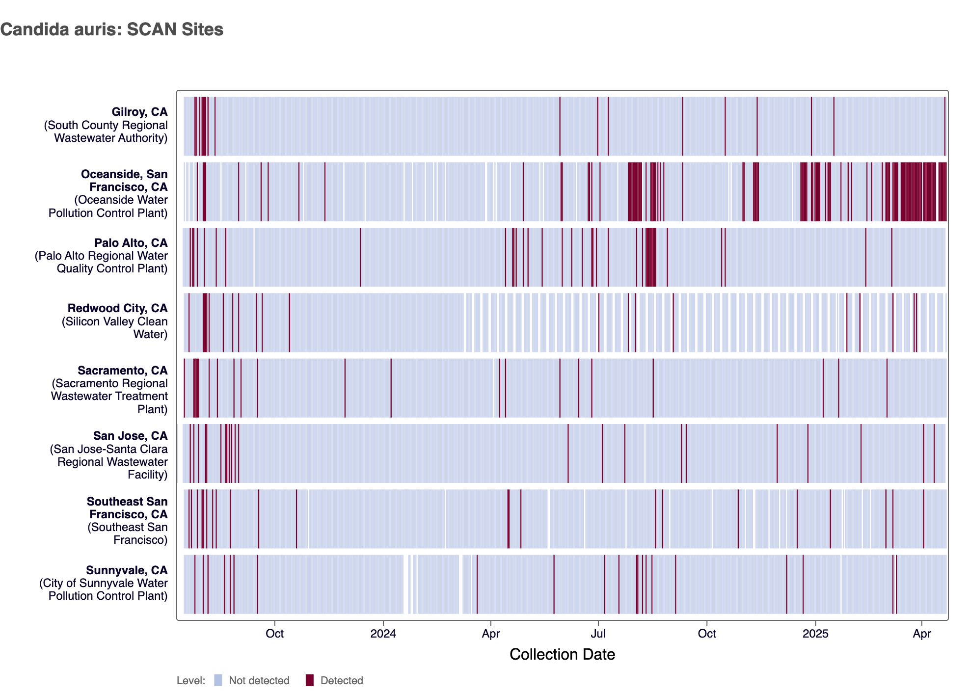 Candida auris DNA was detected at 4 SCAN sites in the last 3 weeks (Gilroy, Oceanside SF, San Jose, and Southeast SF).