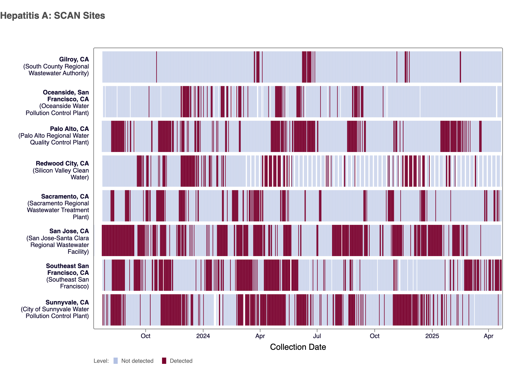 Hepatitis A RNA was detected in ~15% of samples collected at SCAN sites in the last 3 weeks.