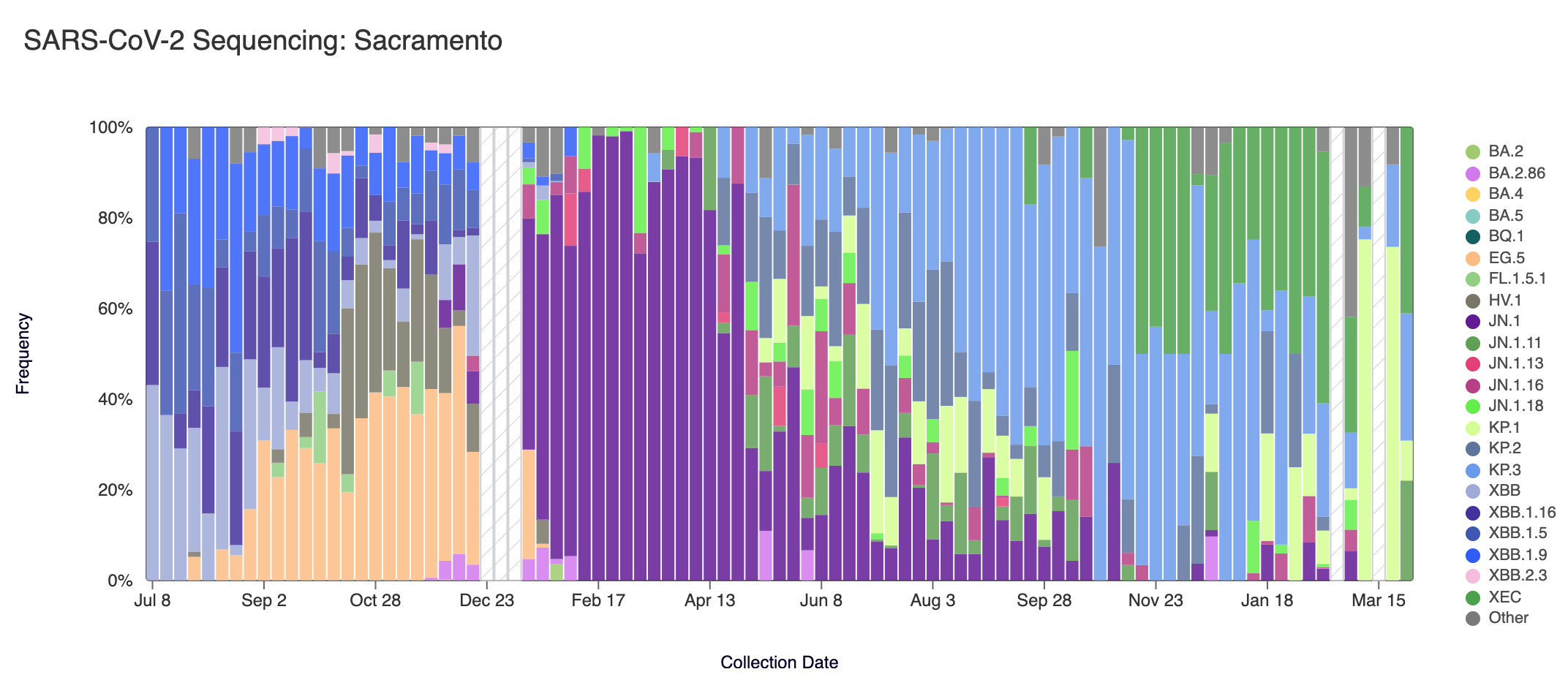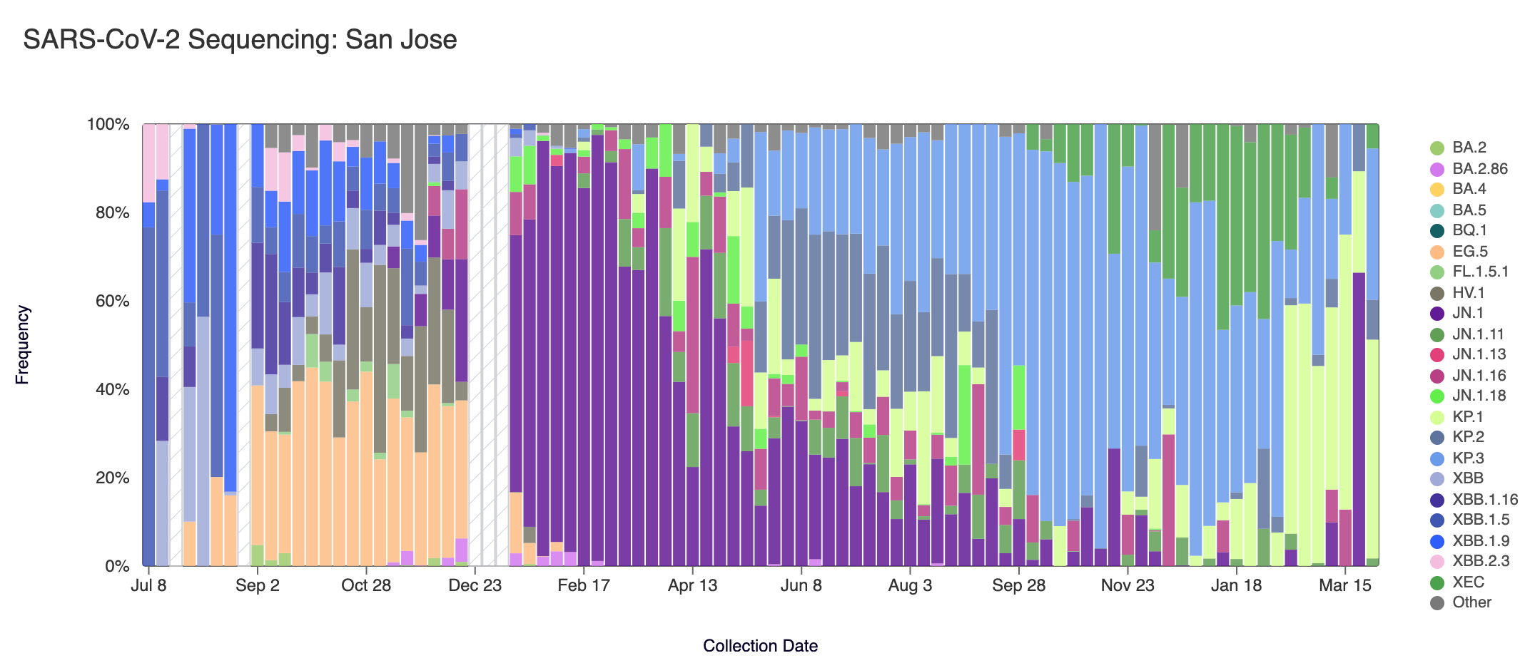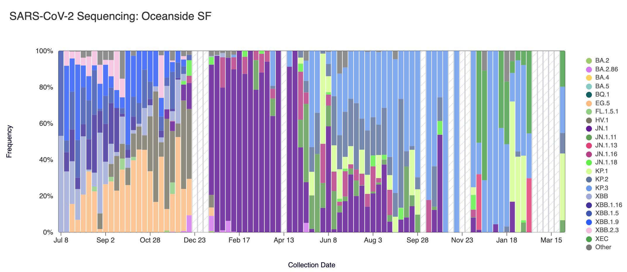 Below are plots from Oceanside SF, Sacramento, San Jose, and Southeast SF showing the relative proportions of different variants inferred from sequencing the entire genome of SARS-CoV-2. White and grey striped bars indicate no data is currently available for that week.