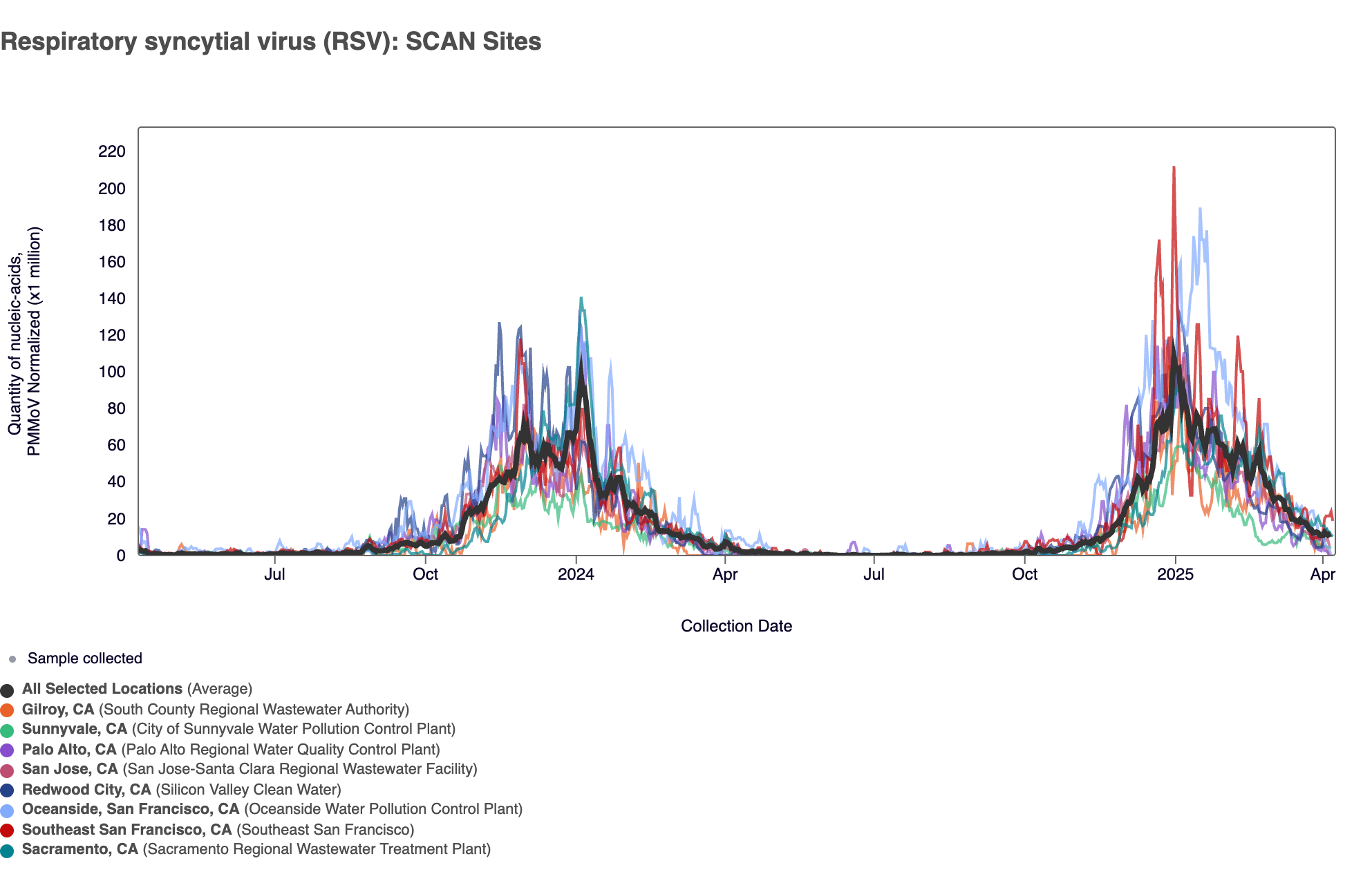In the chart below (representing data from the past 2 years), the population weighted average line across all the SCAN sites is shown in black, and you can see the current concentrations relative to the peak RSV levels from the end of 2023 going into 2024. The link to the chart below is here if you would like to interact with it.