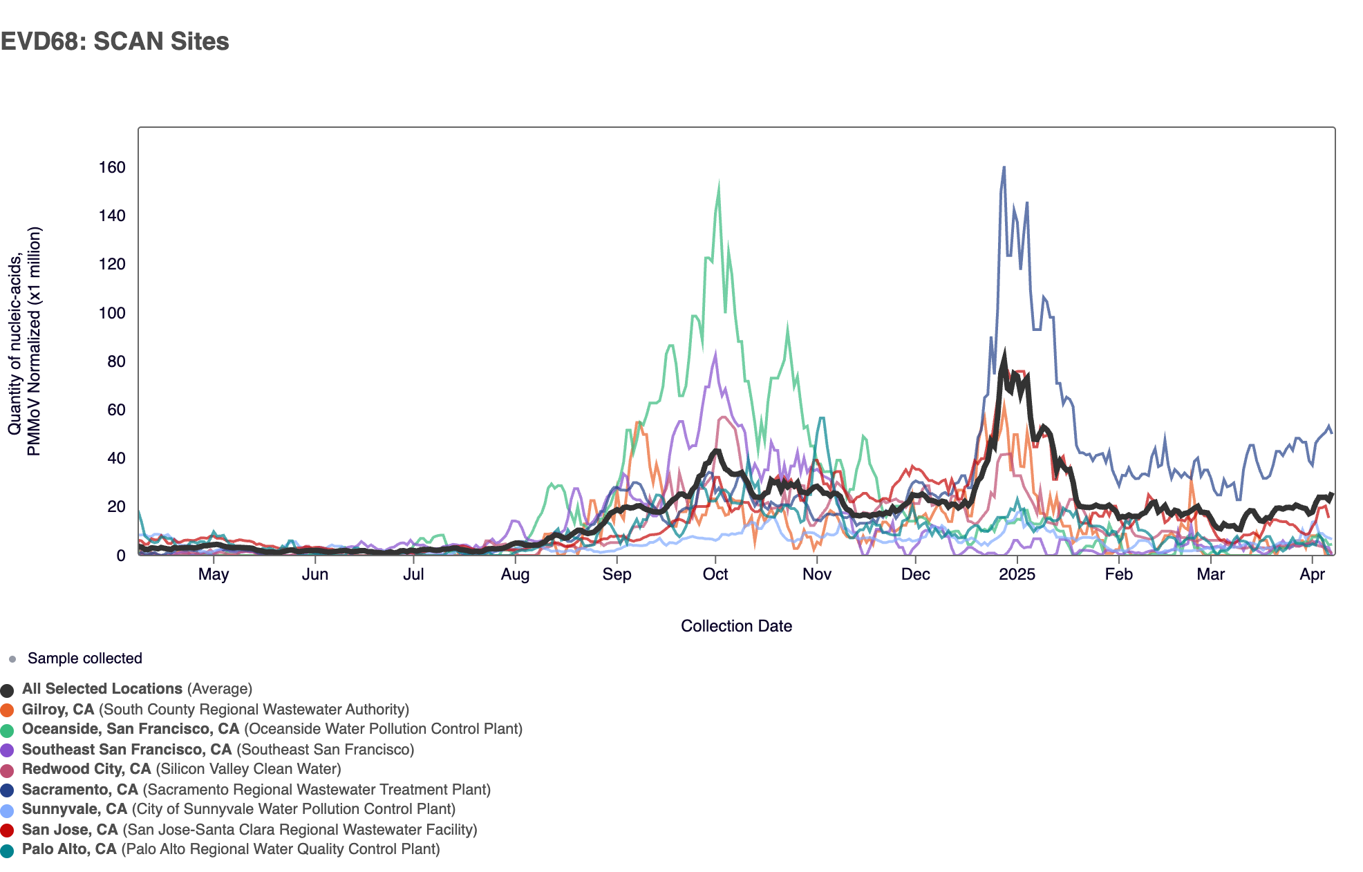 EV-D68 RNA was detected in ~82% of samples collected at all 8 SCAN sites in the last 3 weeks. The median EV-D68 RNA concentration across all 8 SCAN sites in the last 3 weeks was 3,724 copies per gram. Across the national WWSCAN network only a handful of sites are still in seasonal onset for EV-D68 with all of these sites being in the Bay Area and Central Valley in California.