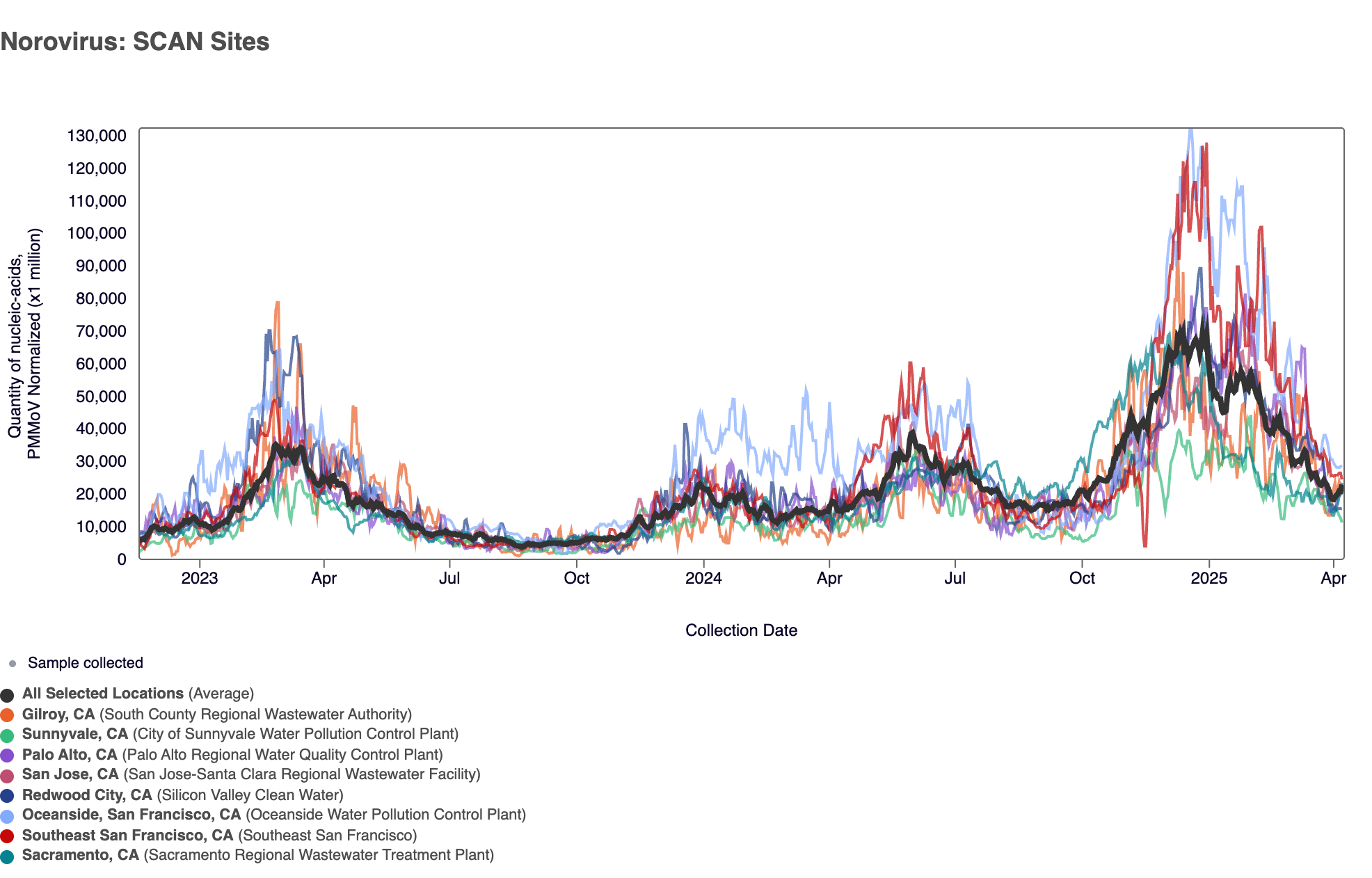 Norovirus GII RNA was detected in 100% of samples from SCAN sites over the last 3 weeks, which is what we are observing across the national WWSCAN sites as well. In the chart below, the population weighted average line across all the SCAN plants is shown in black (since monitoring began in late 2022). Norovirus concentrations remain elevated across all 8 SCAN sites and are still higher than they were this time last year but are decreasing.