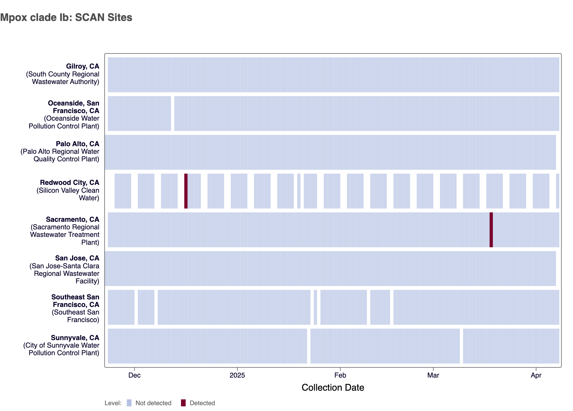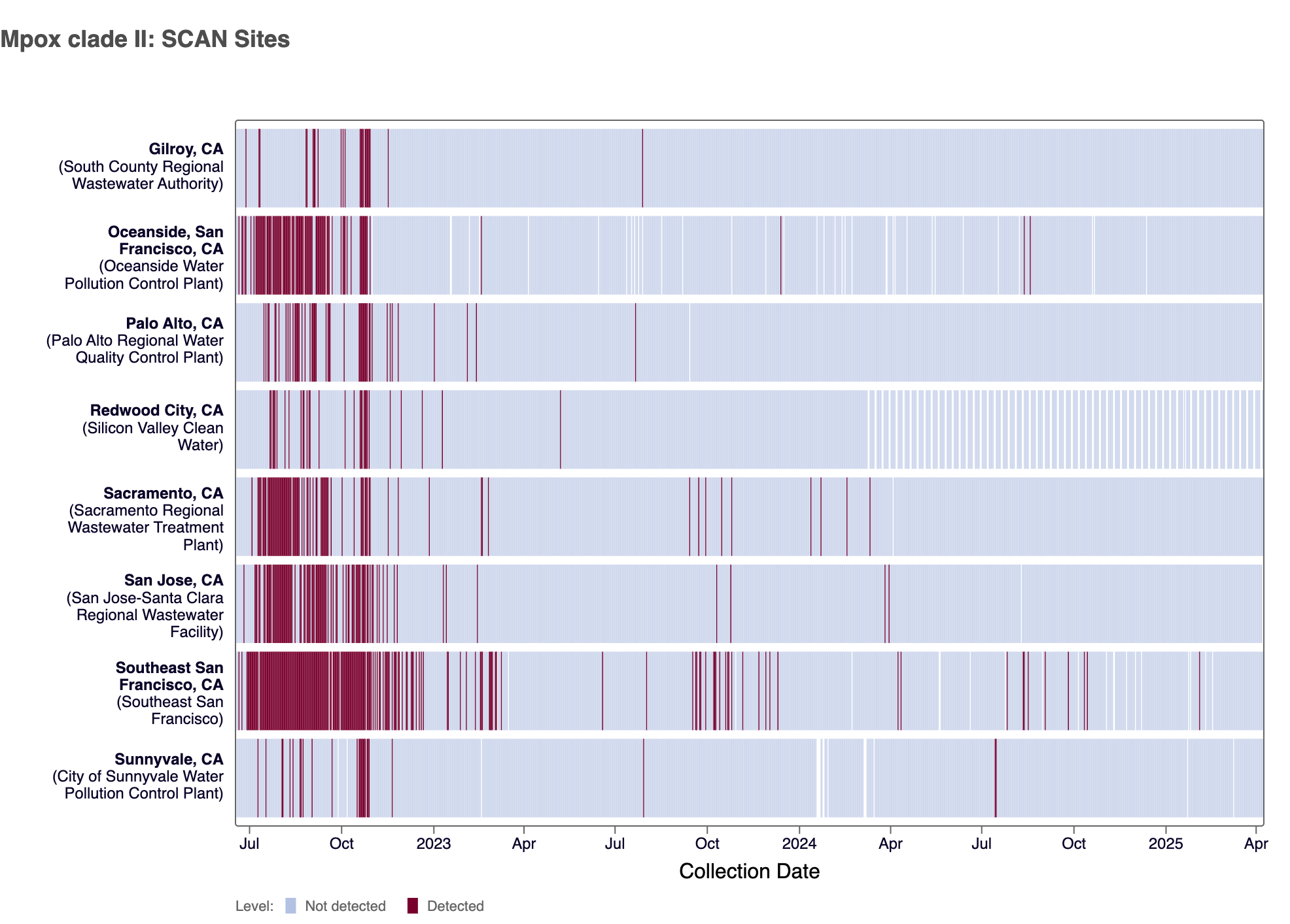 The heat map below shows all the SCAN sites as a row, and each date as a column since June 2022. The color blue means that Mpox clade II DNA was not detected in the sample, and the dark red color means it was detected. White indicates no sample was collected. The chart shows all the data we have collected. You can access the chart here.