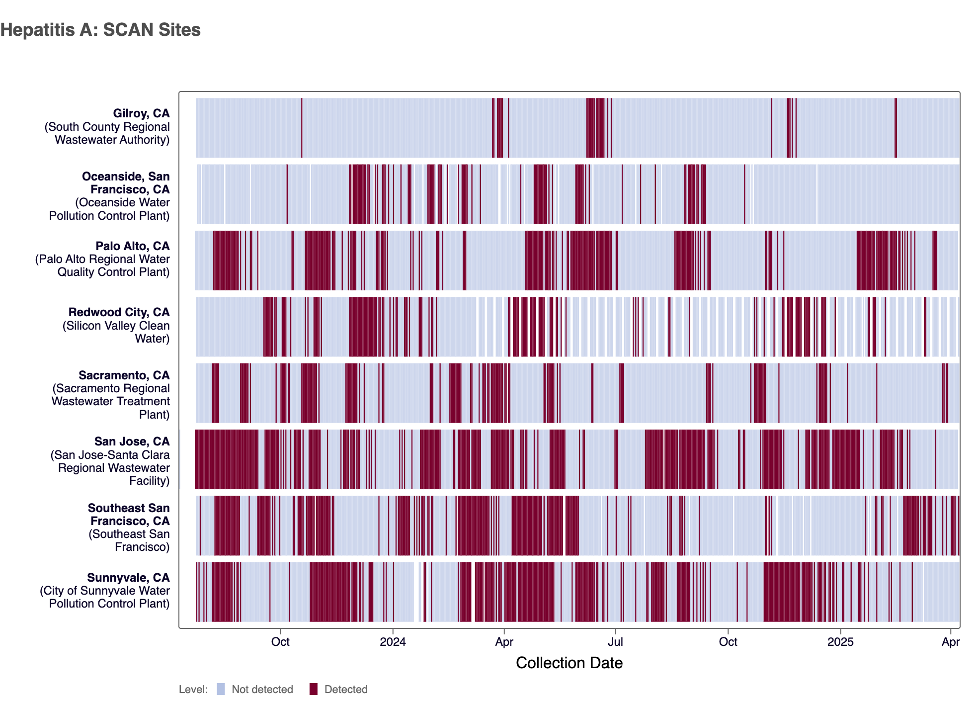 The heat map below shows all the SCAN sites as a row, and each date as a column for all data collected since monitoring began in July 2023. The color blue means that Hepatitis A RNA was not detected in the sample, and the dark purple color means it was detected. White indicates no sample was collected. You can access the chart here.