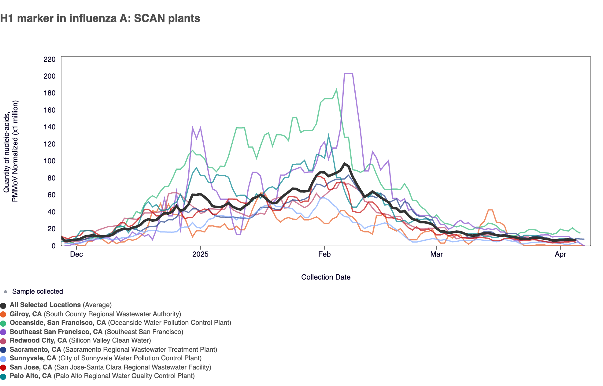 ~84% of samples in the past 3 weeks have tested positive for the H1 marker in Influenza A. The chart below shows H1 marker data from all the SCAN plants since we resumed the H1 assay at the end of 2024. The population weighted average across the SCAN plants is shown in black. Evident in the plot below are decreasing concentrations of the H1 marker across all 8 SCAN sites.