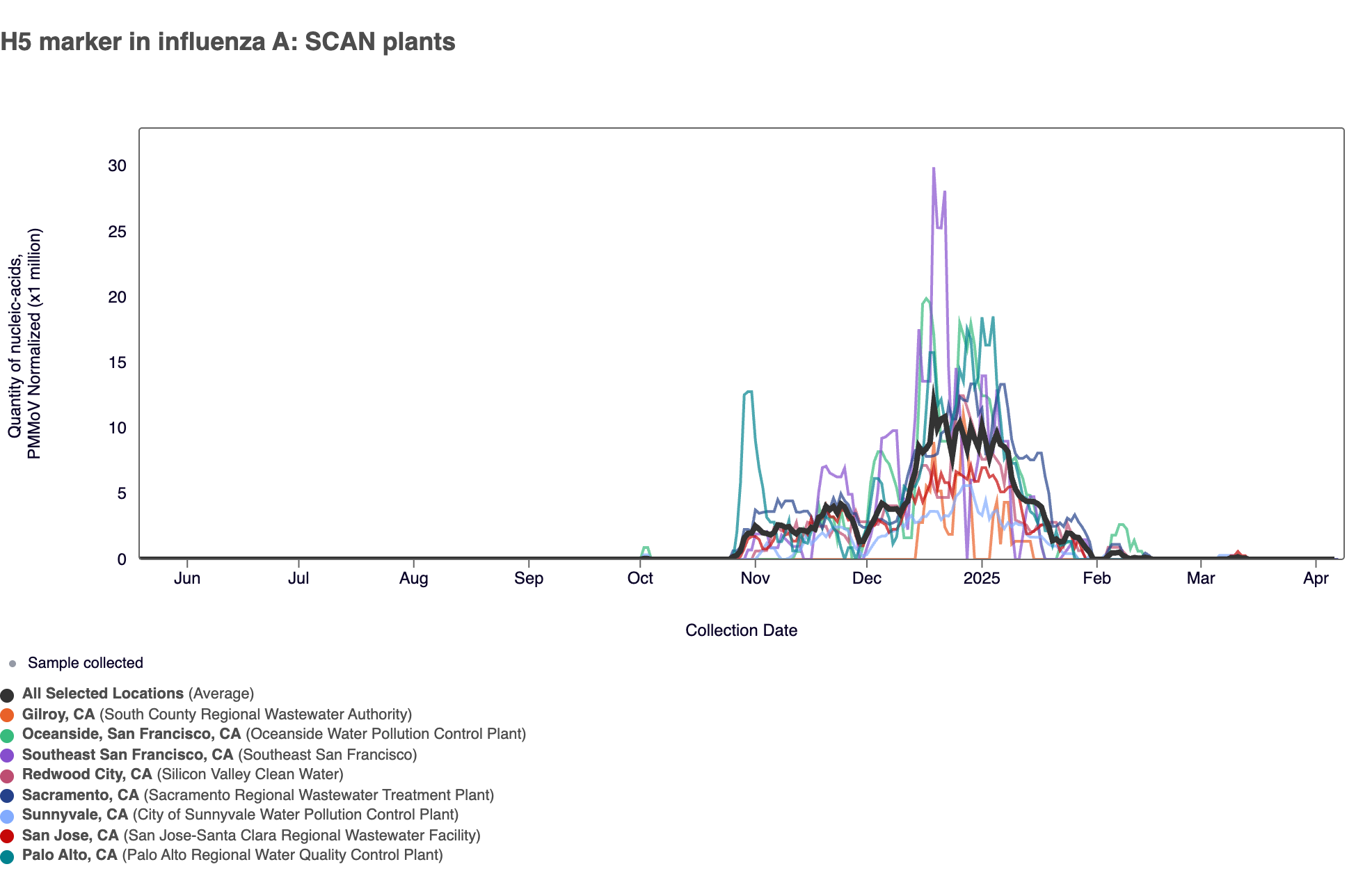 Evident in the chart below H5 marker concentrations have come down from the elevated levels we saw during the Nov 2024 - Jan 2025 peak.