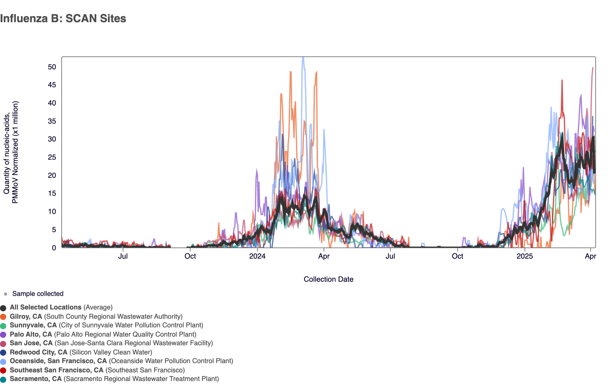 Influenza A (IAV) RNA was detected in 91% of samples in the past 3 weeks. The median IAV RNA concentration across all 8 SCAN sites in the last 3 weeks was 7,380 copies per gram. Below are all the IAV data from all the SCAN plants for the last two years (you can access the graph here). The population weighted average across the SCAN plants is shown in black.