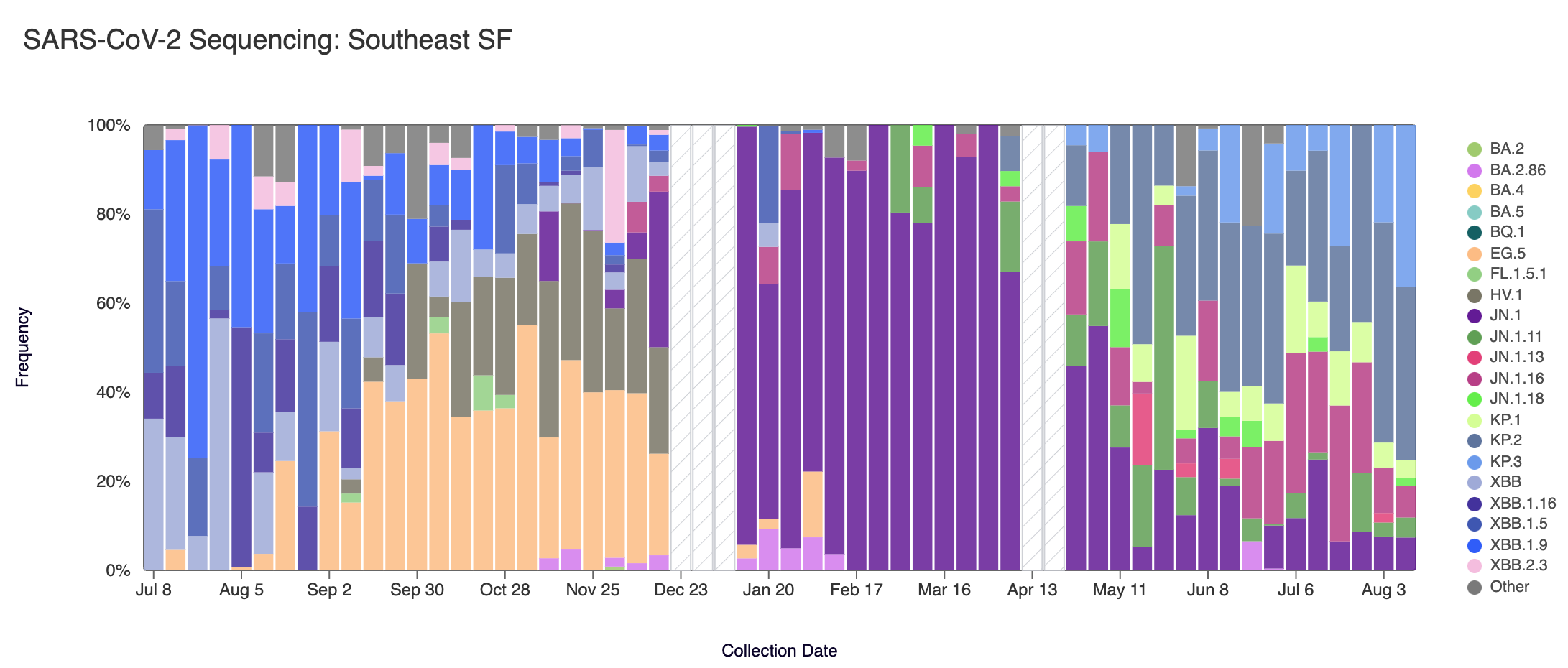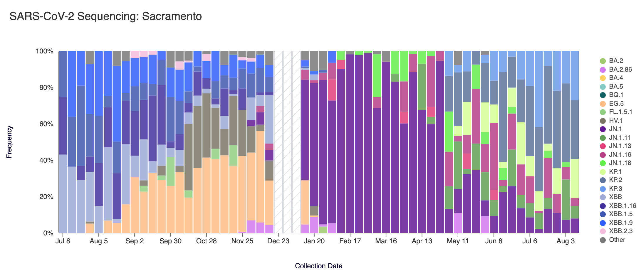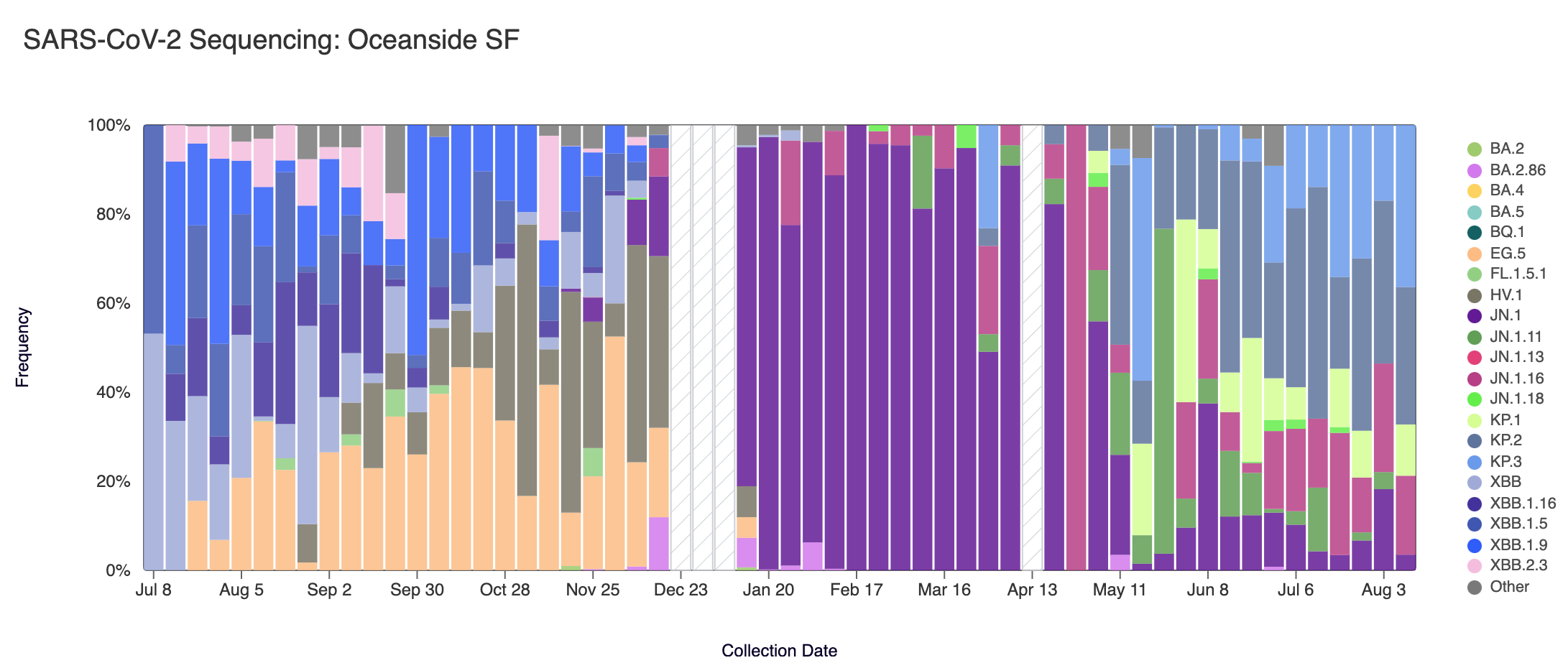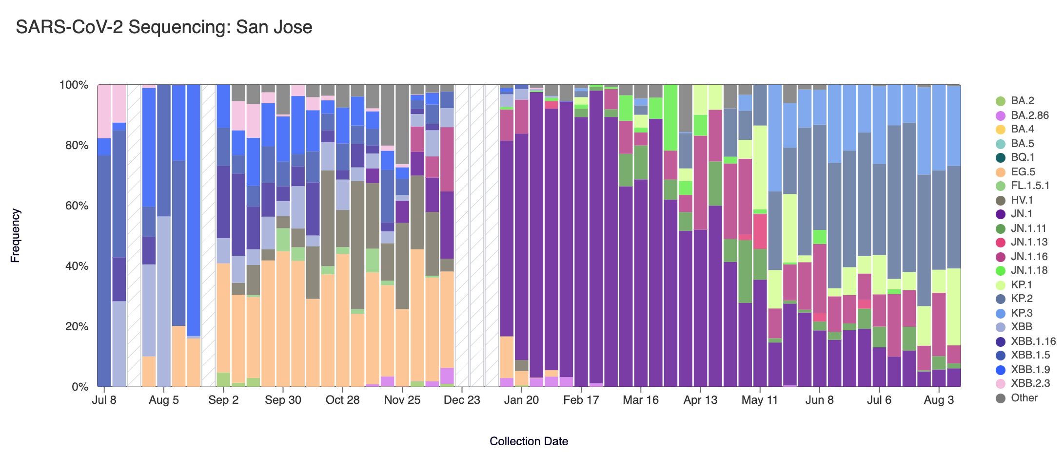 Below are plots from Oceanside SF, Sacramento, San Jose, and Southeast SF showing the relative proportions of different variants inferred from sequencing the entire genome of SARS-CoV-2. White and grey striped bars indicate no data is currently available for that week. In the most recent samples, we are continuing to see greater portions of KP.2 (slate blue), and KP.3 (light blue). Note that the sequencing data are always from samples taken between 1-2 weeks ago (in this case, Aug 10, 2024).