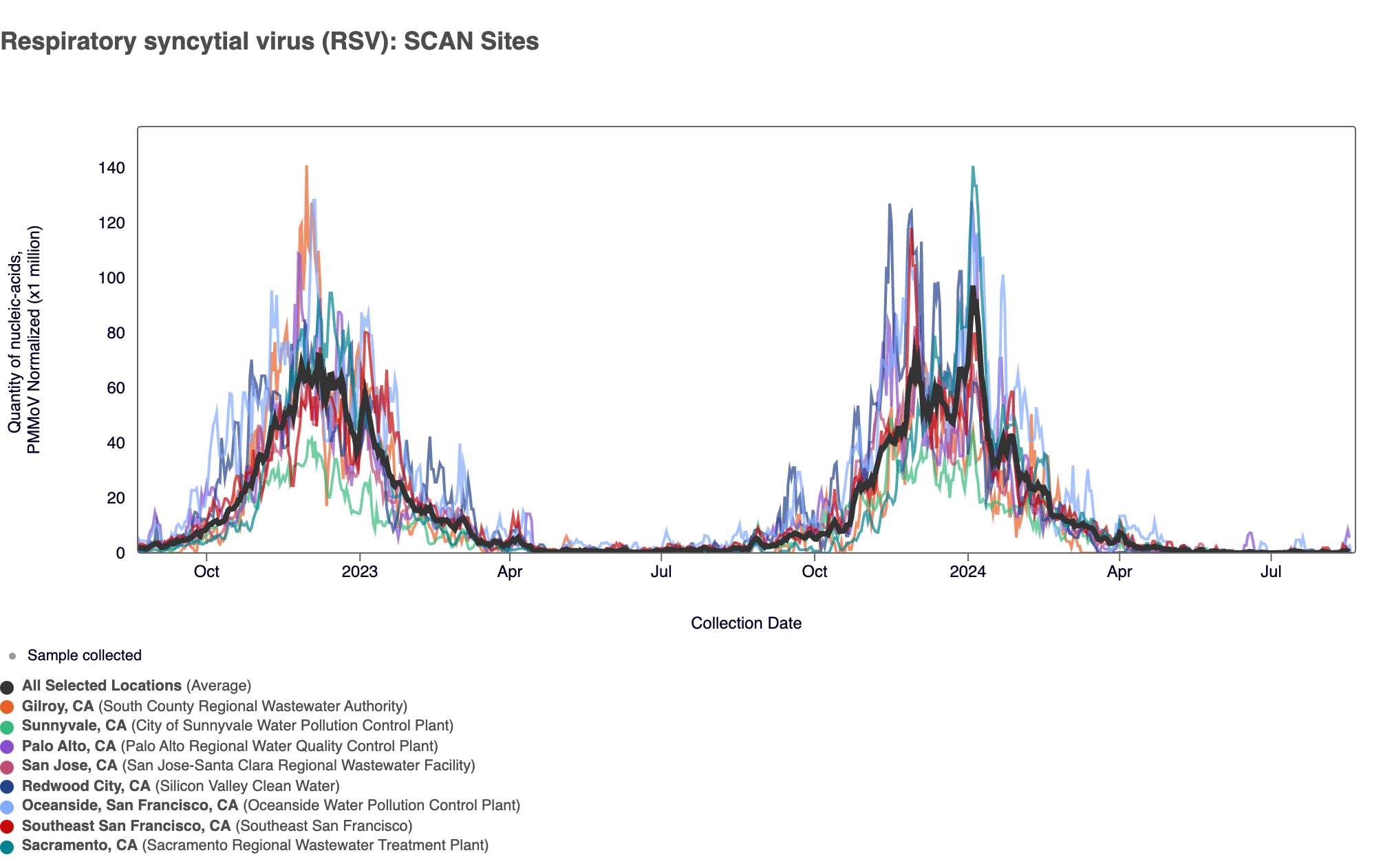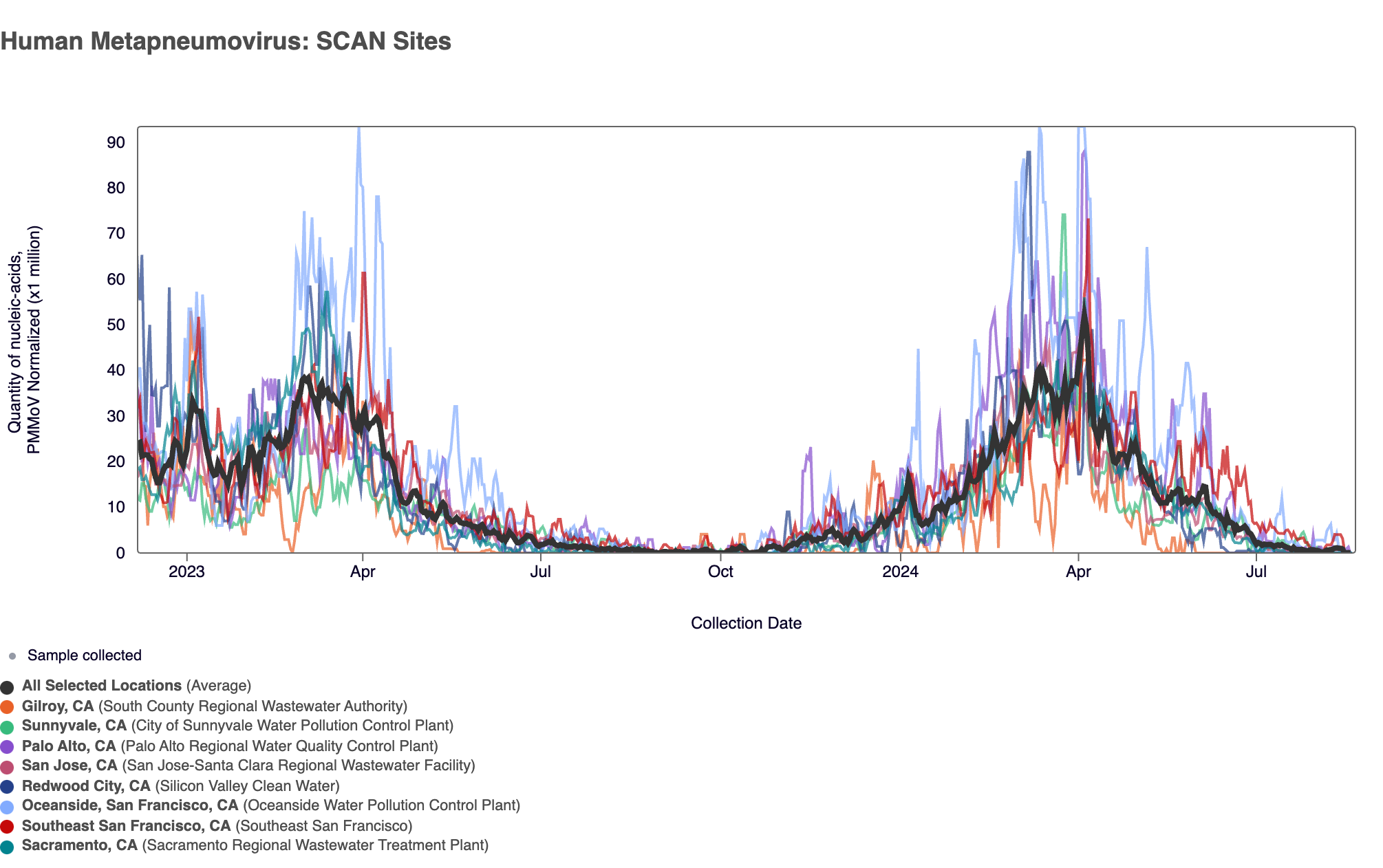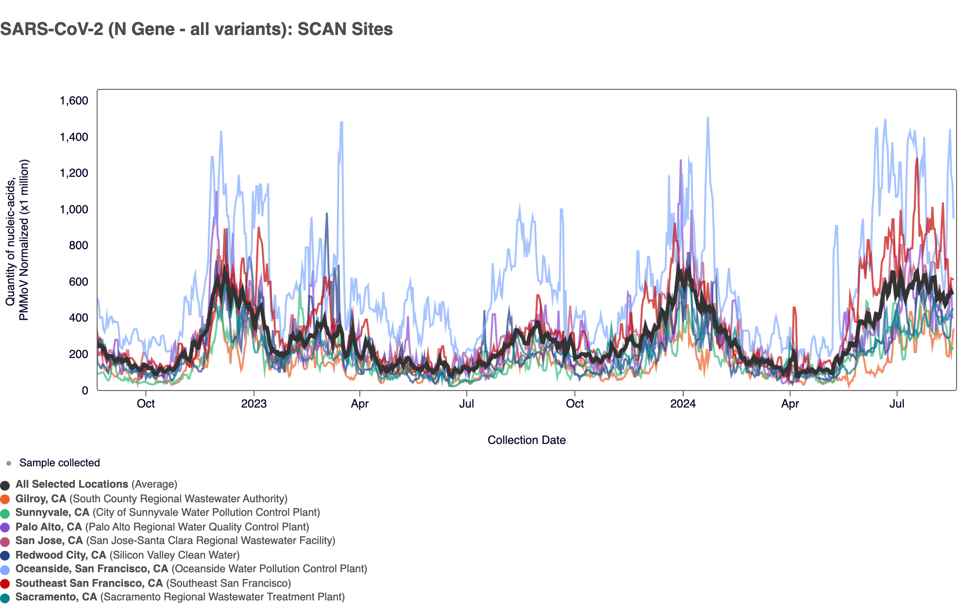 Below are all the data from all the SCAN plants for the last two years. You can access the graph here. The population weighted average across the SCAN plants is shown in black. The population weighted average shows increased concentrations compared to the lower concentrations we measured in early spring 2024.