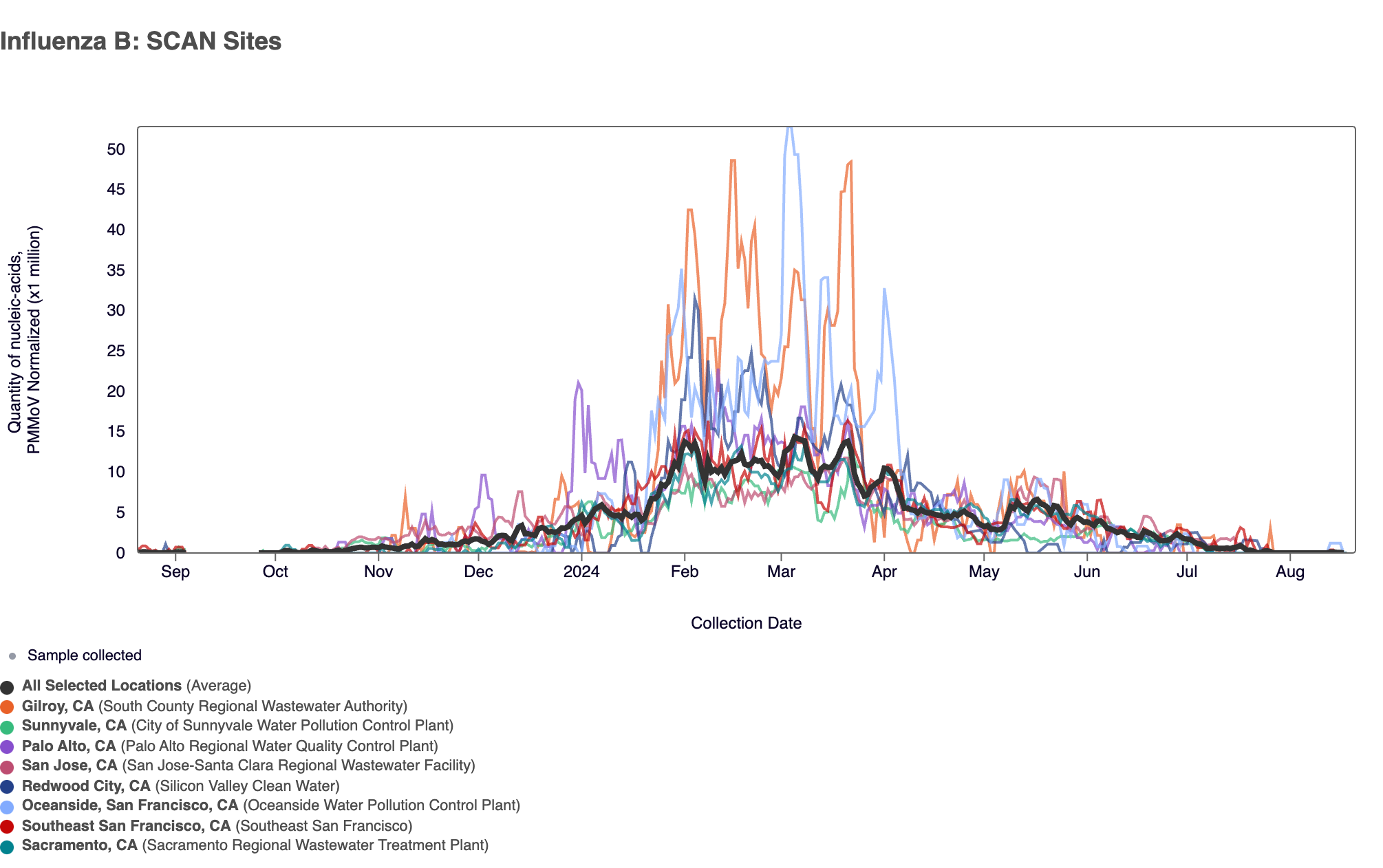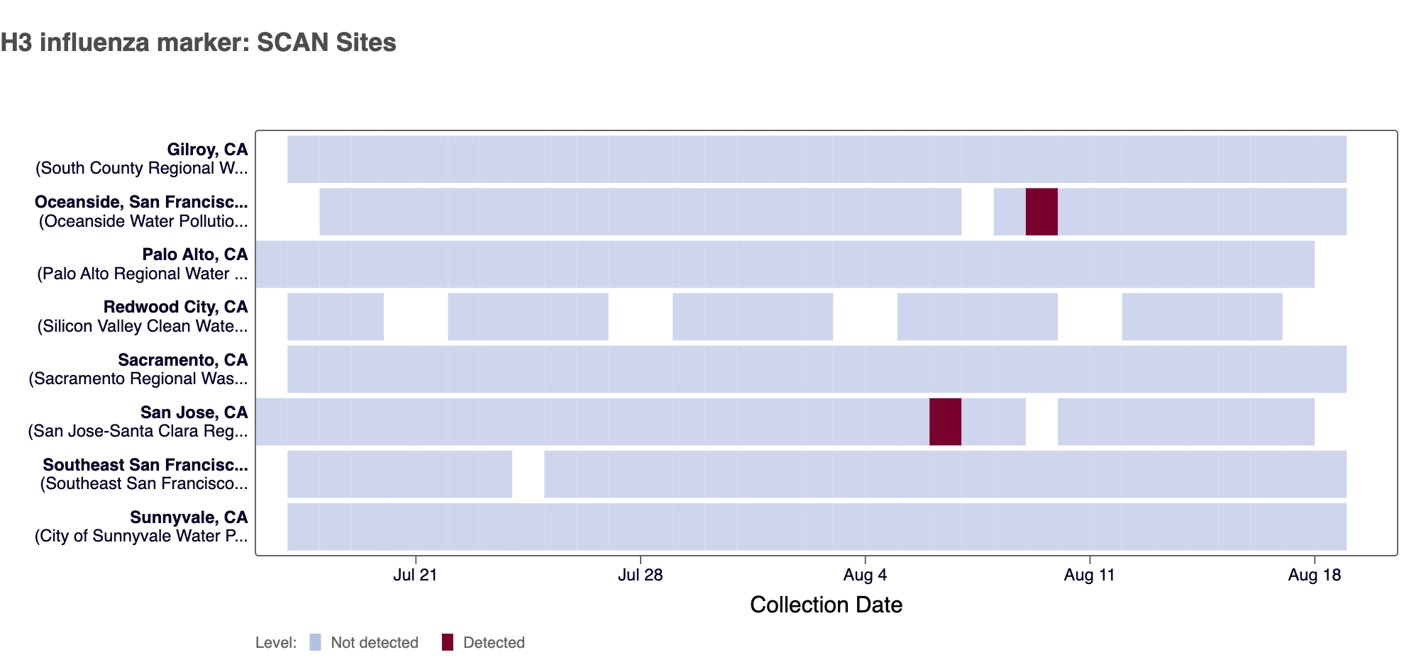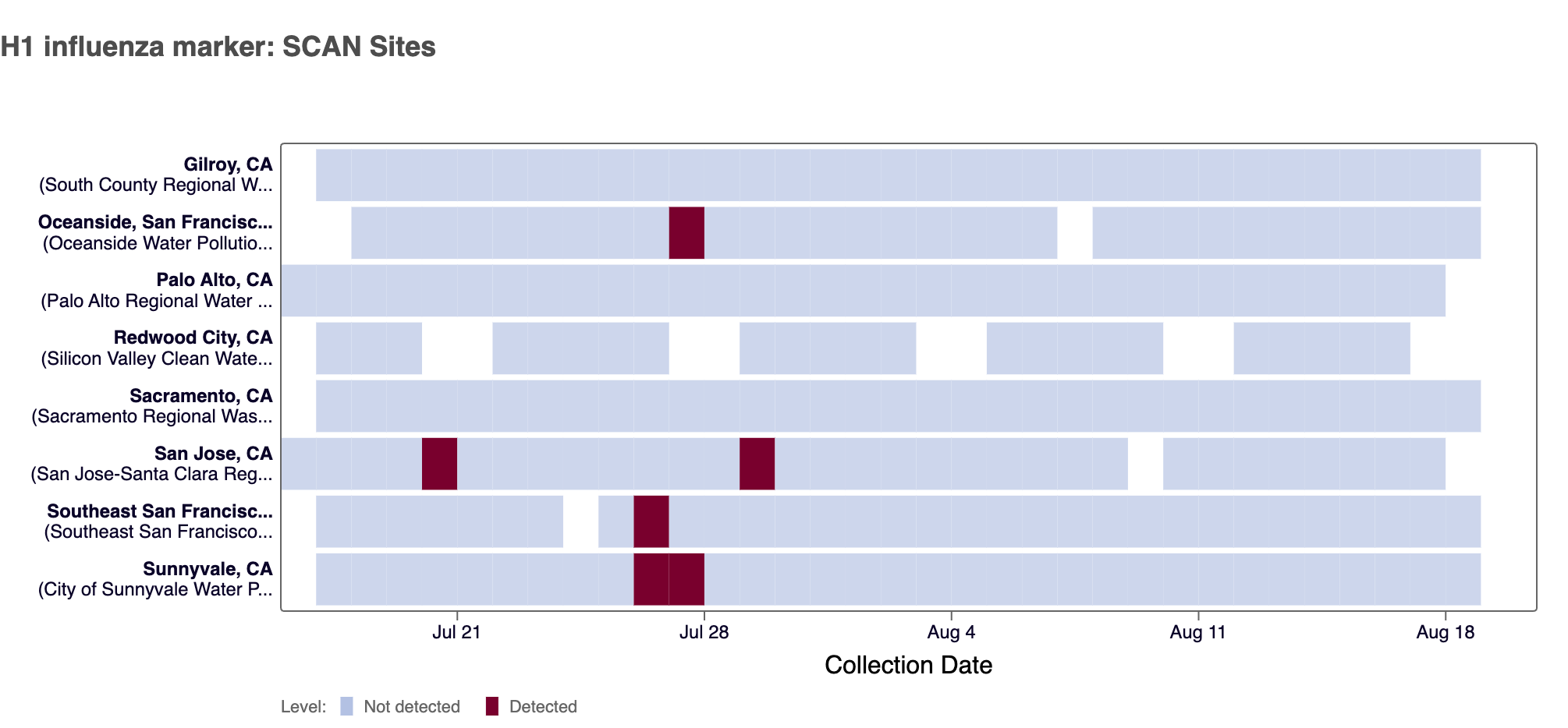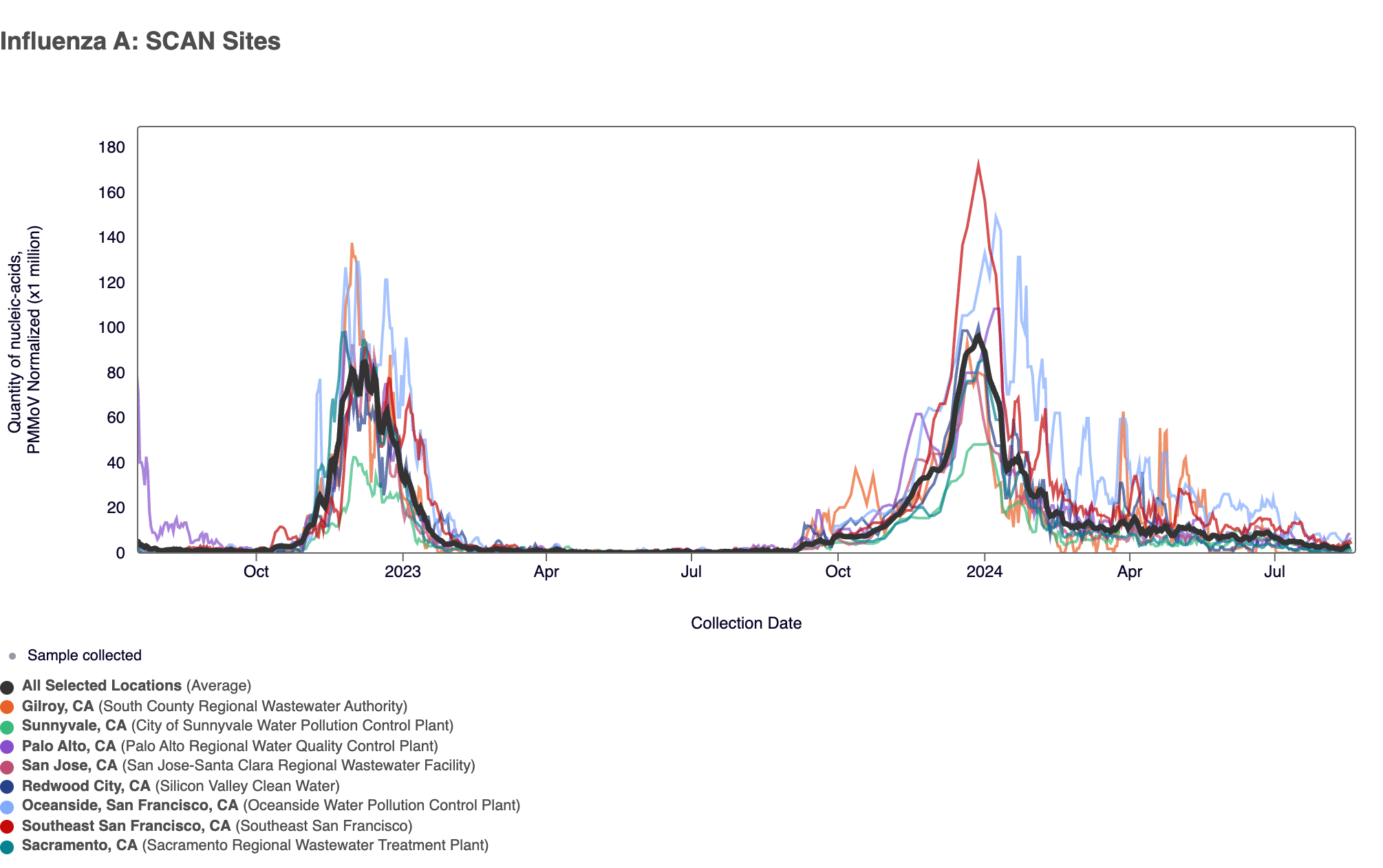 4 sites in the SCAN network (Oceanside SF, San Jose, Southeast SF, and Sunnyvale) have tested positive for the H1 marker in influenza A since we began testing for the marker prospectively in mid July 2024.