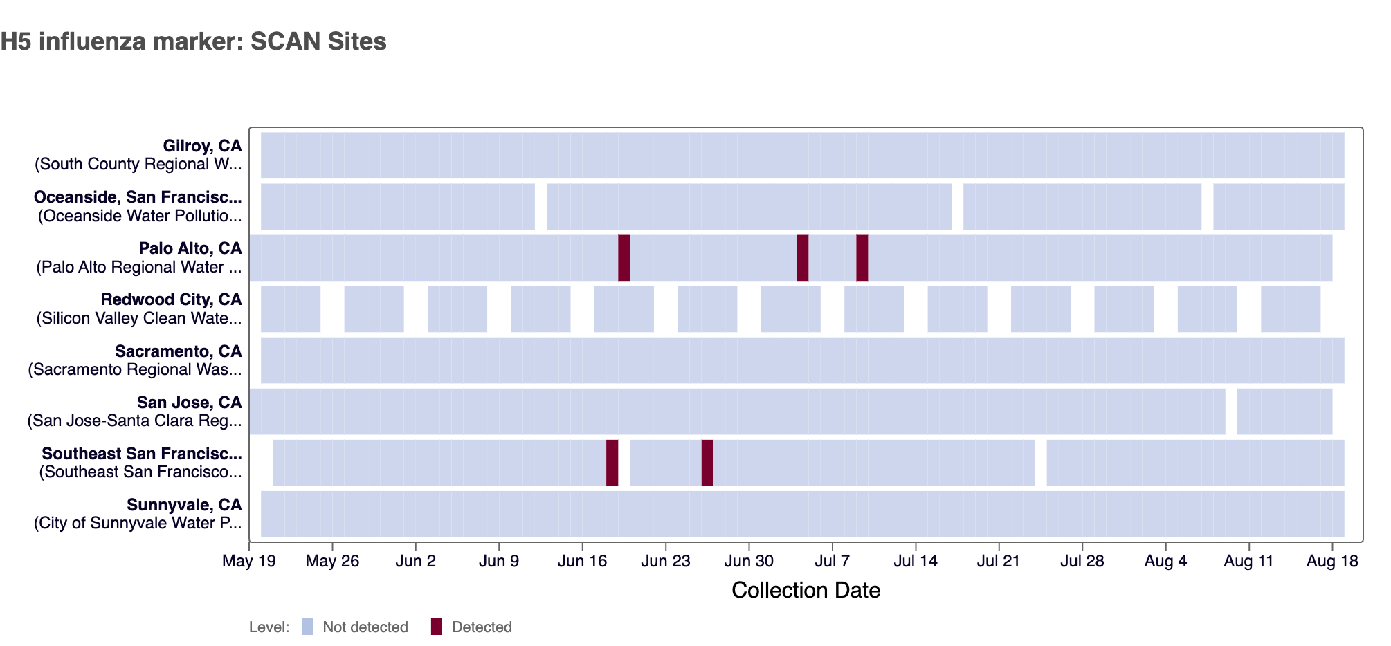2 sites in the SCAN network (Palo Alto and Southeast SF) have tested positive for the H5 marker in influenza A since we began testing for the marker prospectively in May 2024.