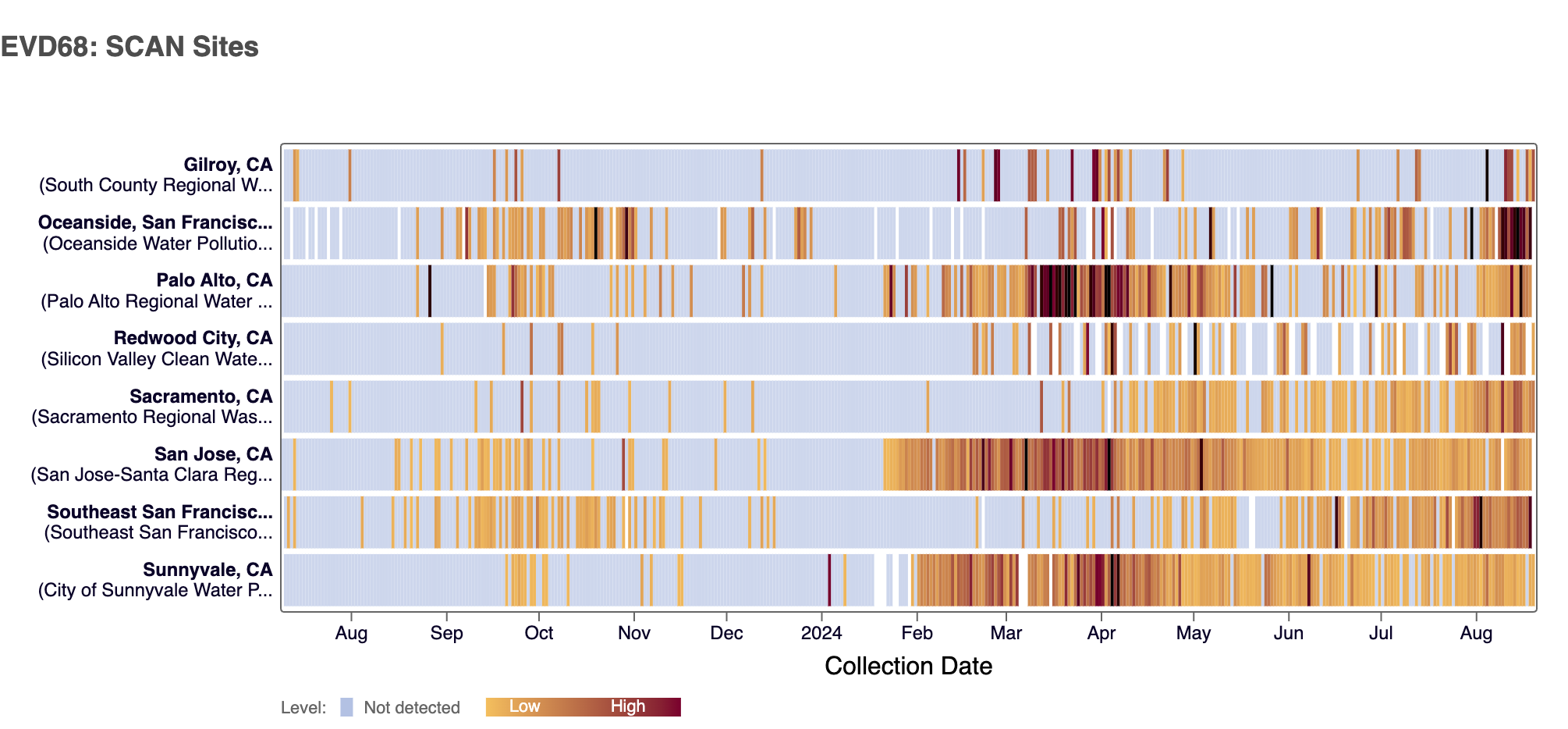 The heat map below shows all the SCAN sites as a row, and each date as a column since monitoring began in July 2023. The color blue means the sample was non-detect for EV-D68 RNA and the colors get darker with higher concentrations. White indicates no sample was collected. You can access the chart here.
