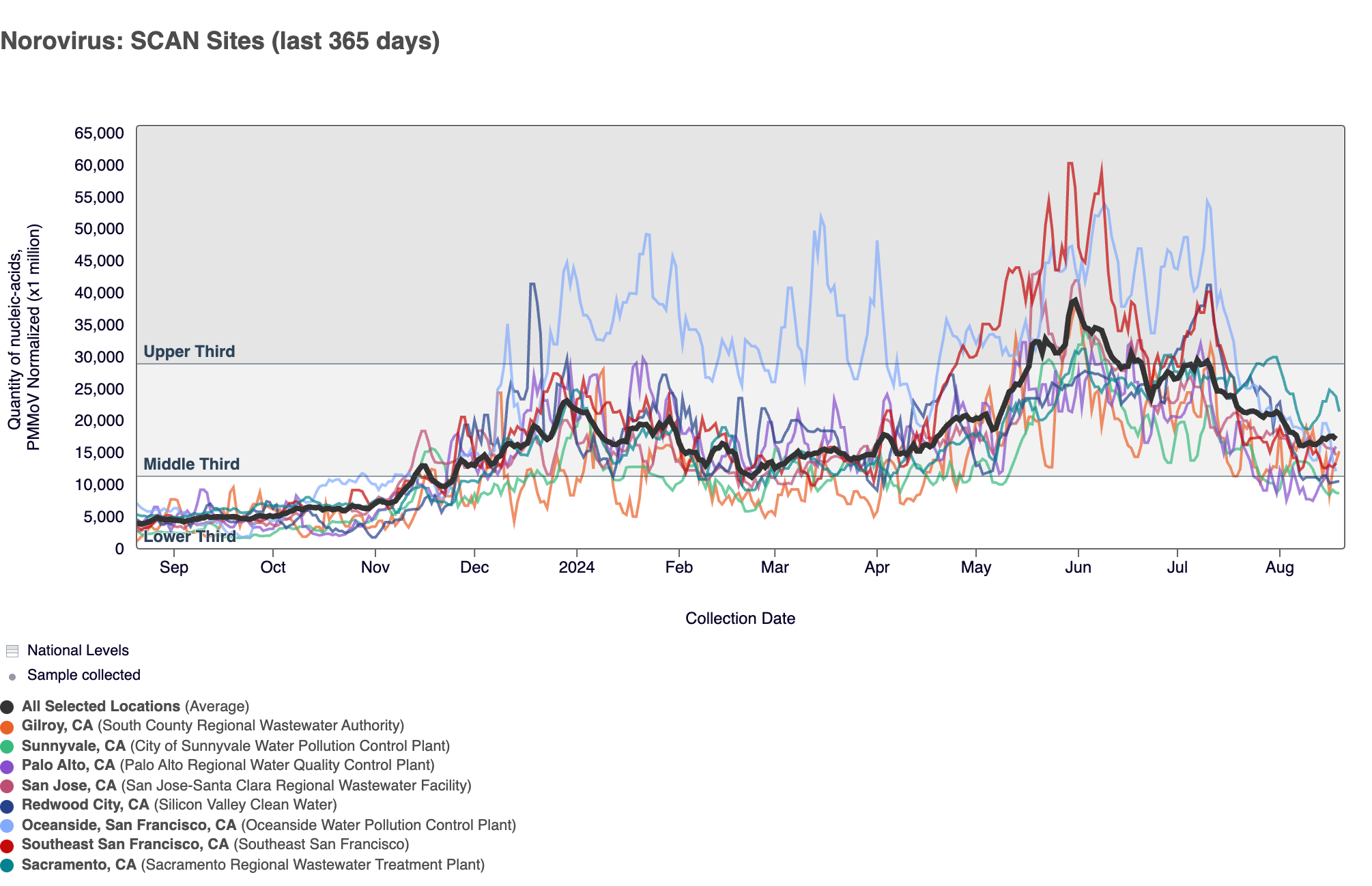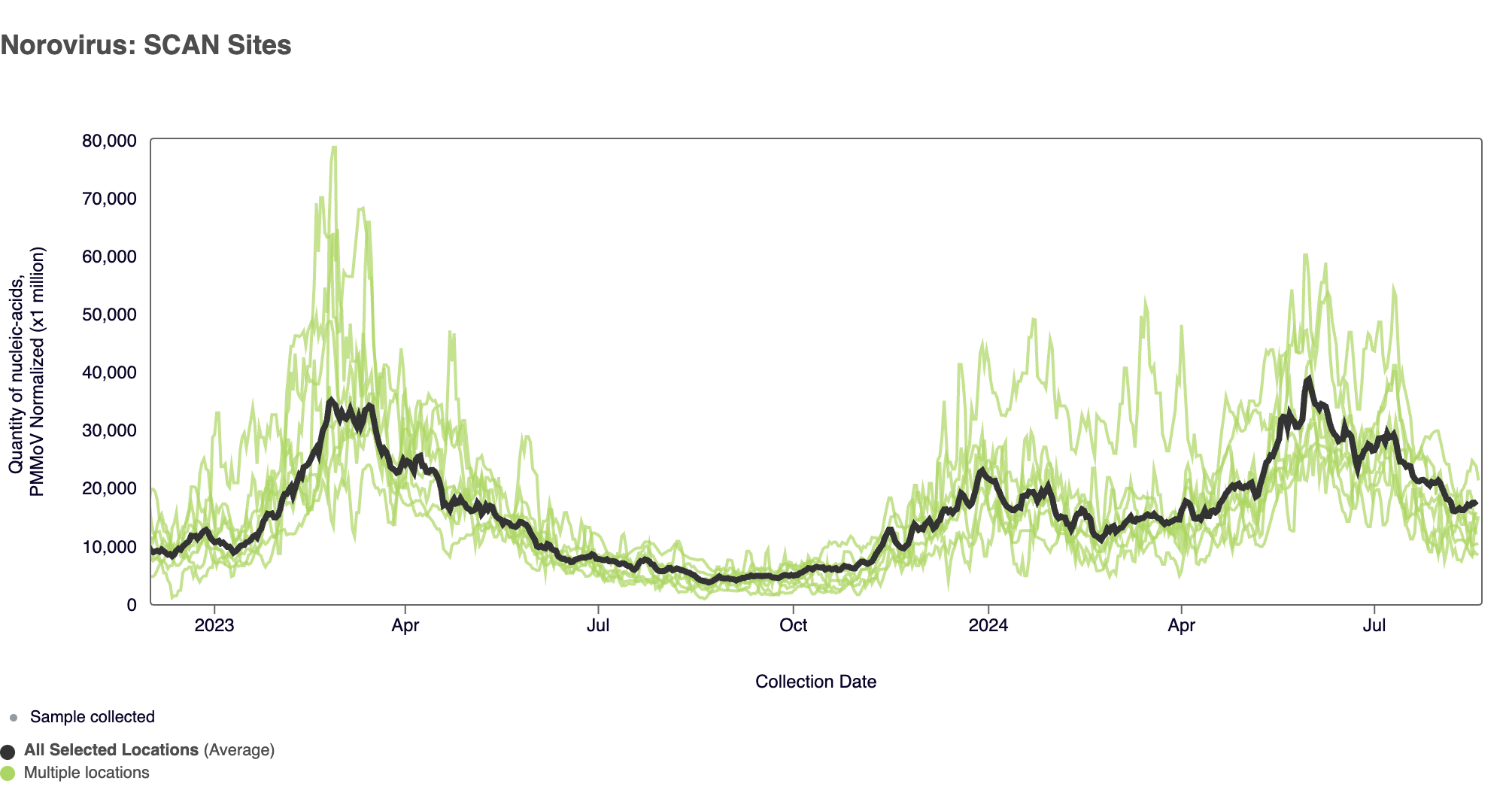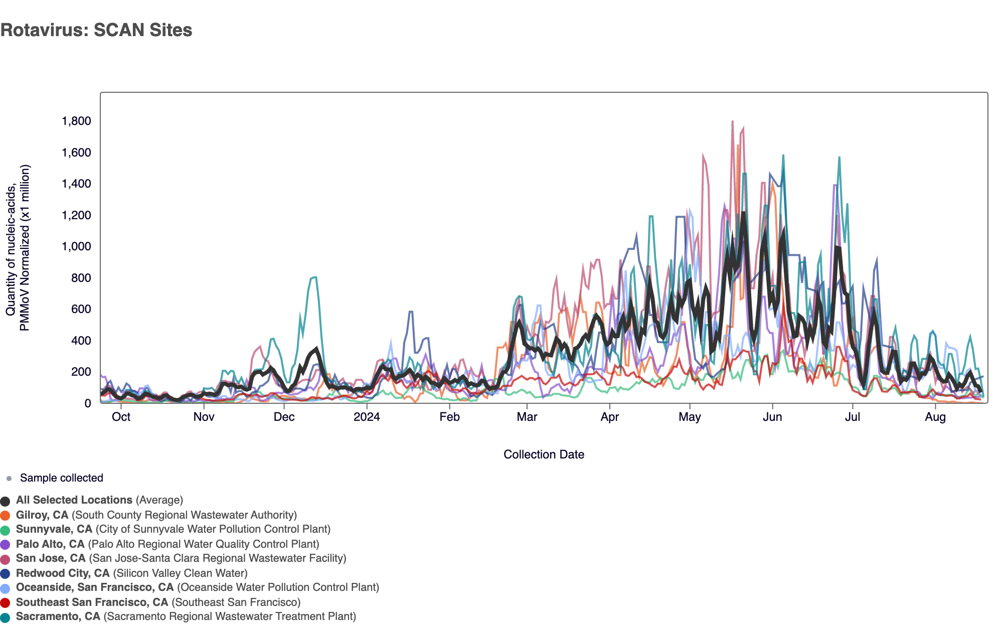 Norovirus GII RNA was commonly detected at all SCAN sites, which is what we are observing across the national WWSCAN sites as well. In the chart below, the population weighted average line across all the SCAN plants is shown in black. We've seen elevated Norovirus concentrations across all SCAN sites since early spring and concentrations are higher than they were this time last year.