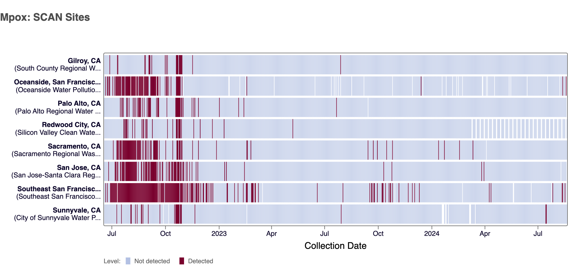 Mpox clade II DNA was not detected at most SCAN sites recently (2 positive detections at Oceanside SF on 8/12/24 and 8/18/24, and 3 positive detections at Southeast SF on 8/11/24, 8/12/24, and 8/16/24 ). Currently all SCAN sites are in the 'LOW' category for Mpox clade II.
