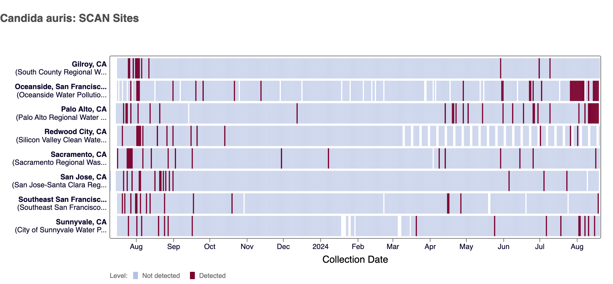 Candida auris DNA was detected at five of the SCAN sites in the last 10 days (Oceanside SF, Palo Alto, Sacramento, Southeast SF, and Sunnyvale).