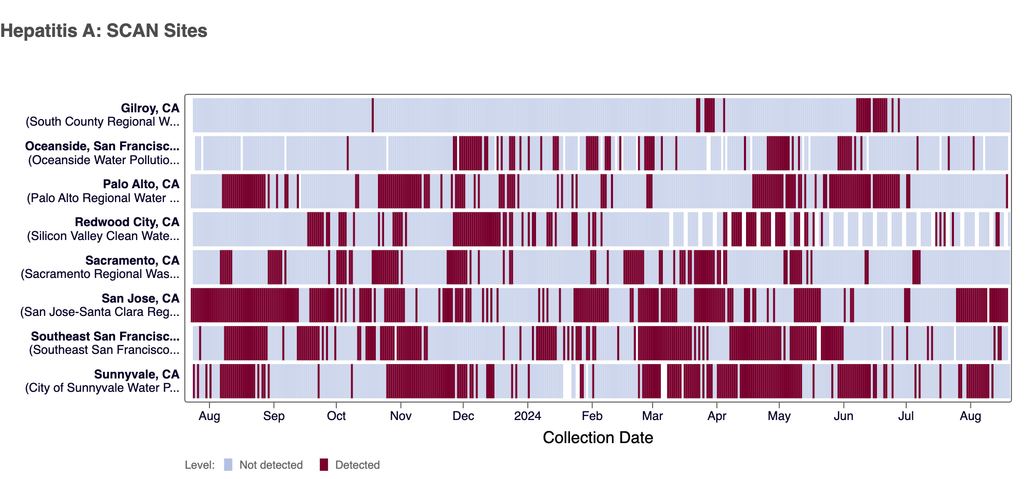 Hepatitis A RNA was detected at five of the SCAN sites in the last 10 days (Palo Alto, San Jose, Southeast SF, SVCW and Sunnyvale). Below are the current wastewater categories for the SCAN sites (the category is determined by the frequency of detection):