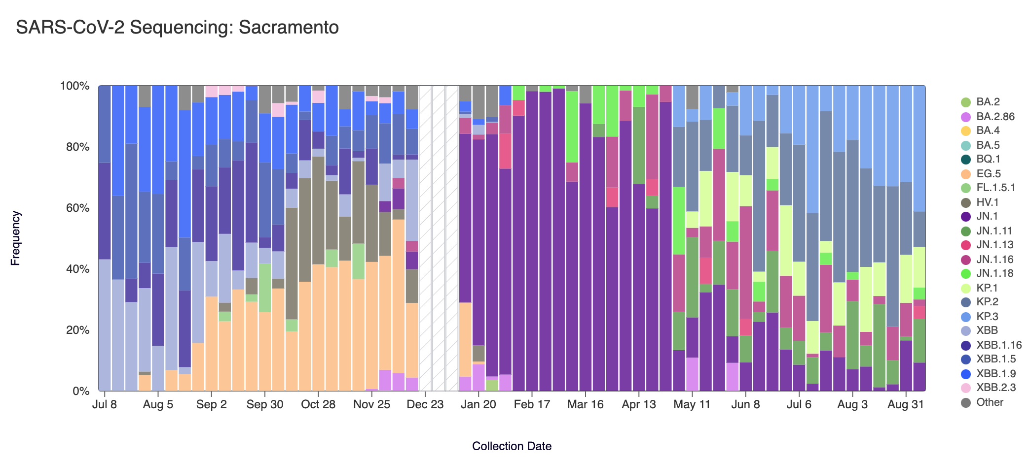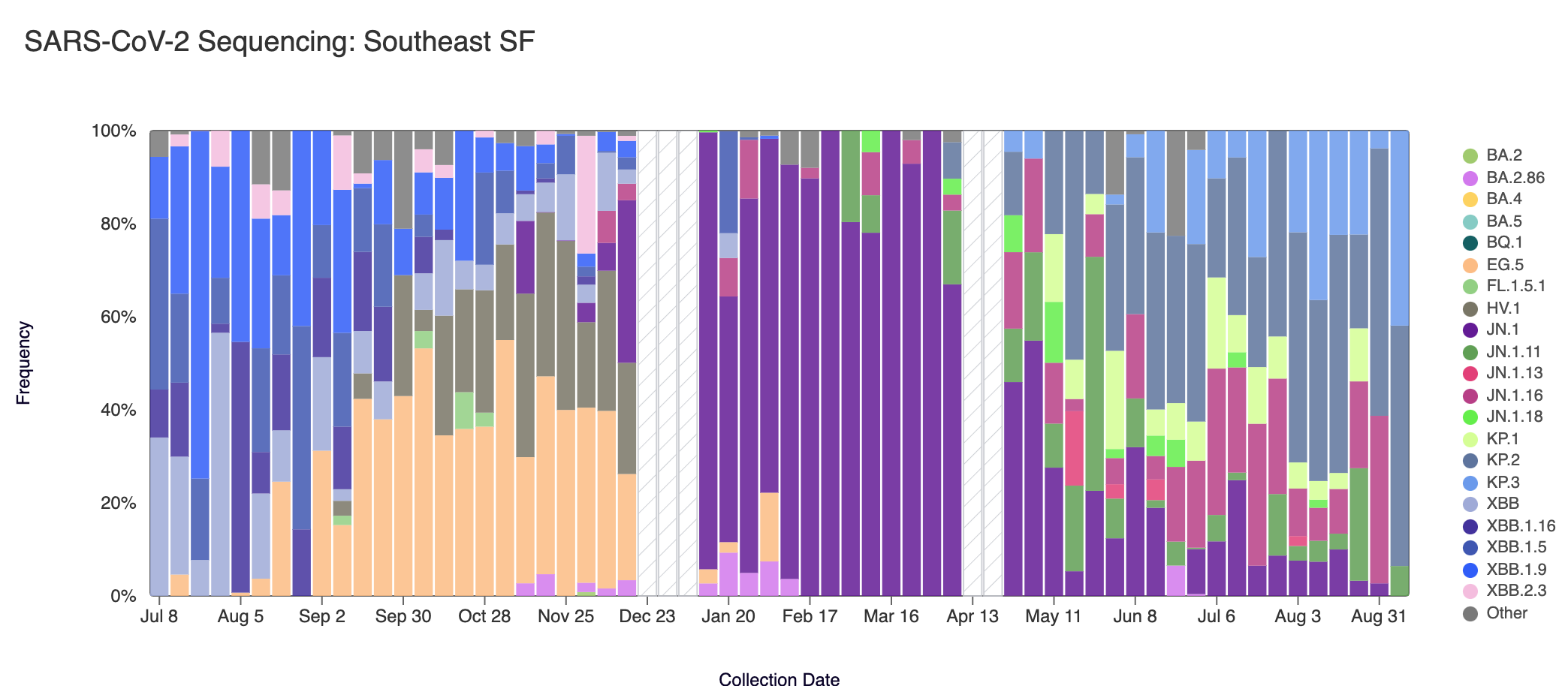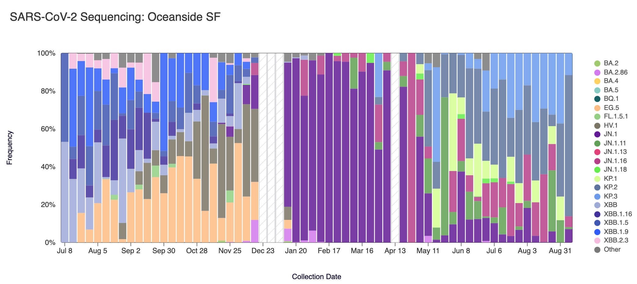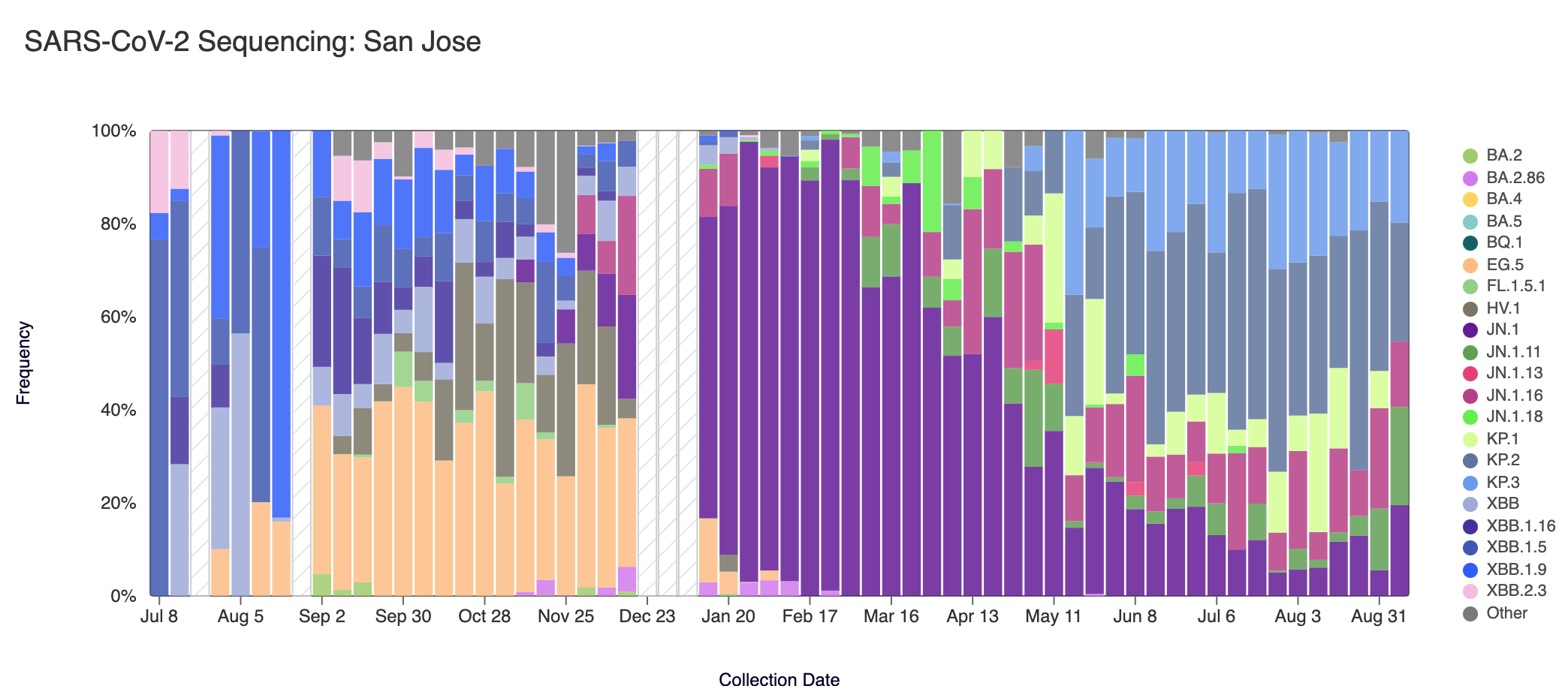 Below are plots from Oceanside SF, Sacramento, San Jose, and Southeast SF showing the relative proportions of different variants inferred from sequencing the entire genome of SARS-CoV-2. White and grey striped bars indicate no data is currently available for that week. In the most recent samples, we are continuing to see greater portions of KP.2 (slate blue), and KP.3 (light blue). Note that the sequencing data are always from samples taken between 1-2 weeks ago (in this case, Sept 7, 2024).
