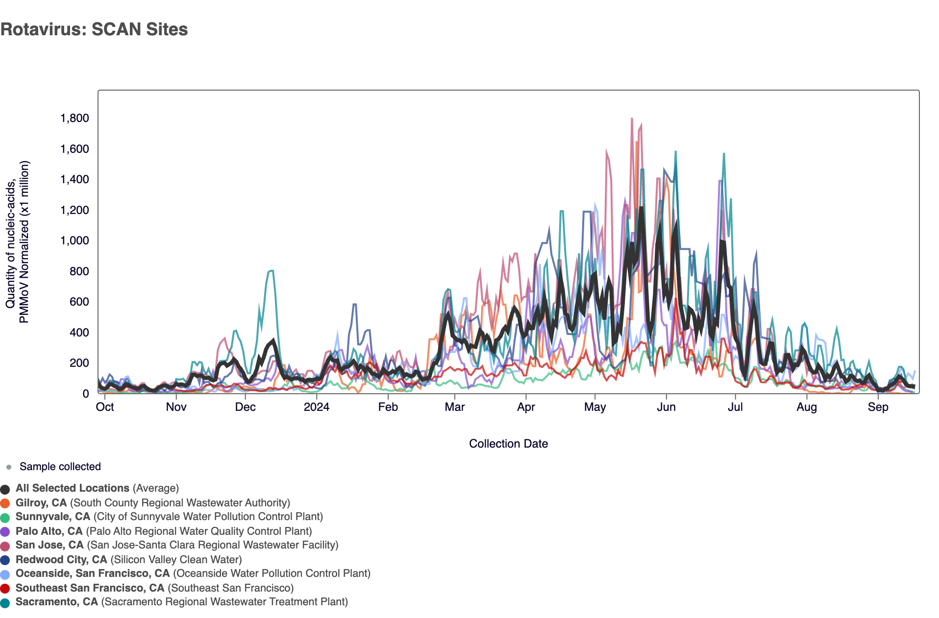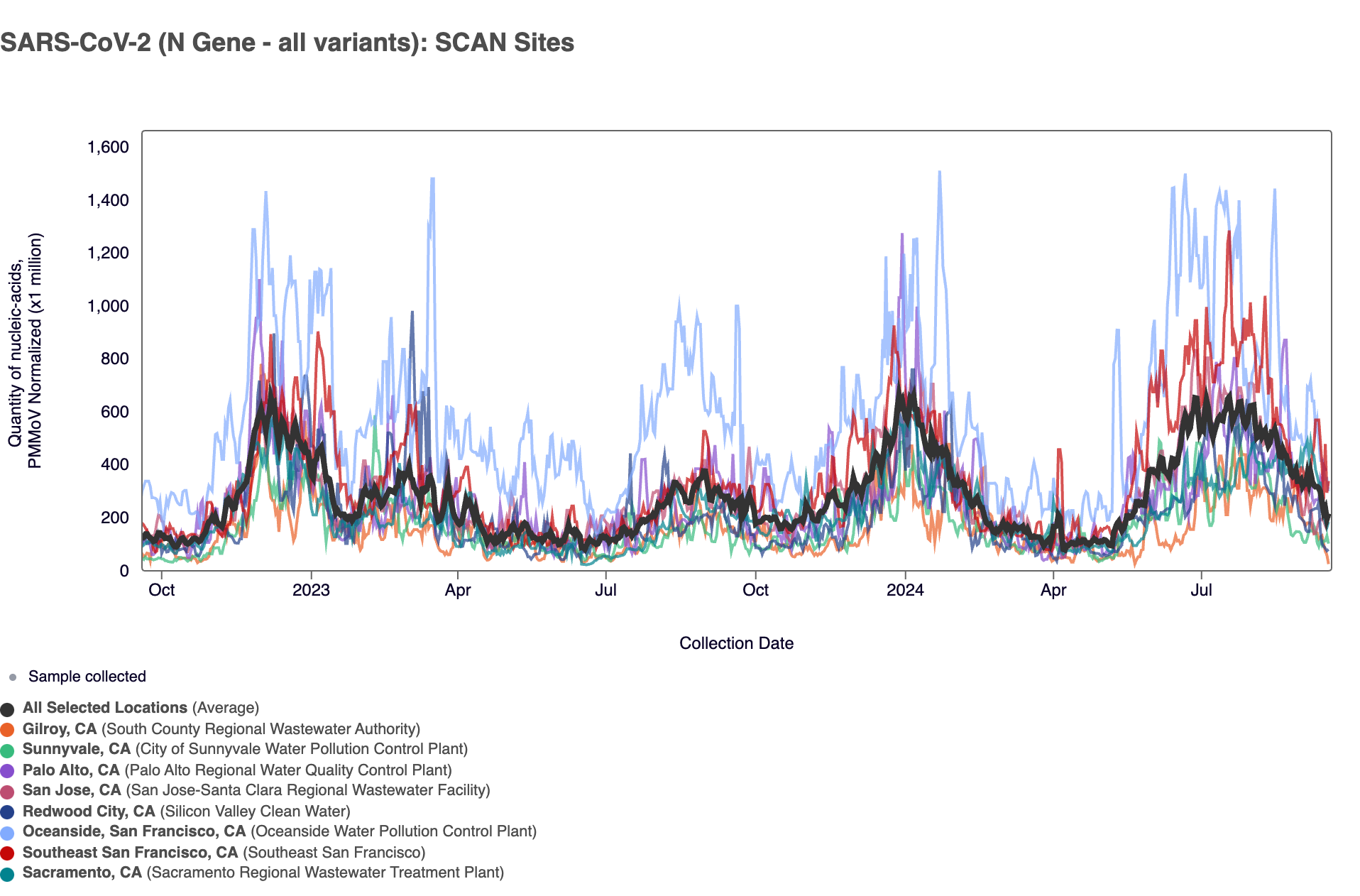 Below are all the data from all the SCAN plants for the last two years. You can access the graph here. The population weighted average across the SCAN plants is shown in black. The population weighted average still shows elevated concentrations compared to this time last year, but is coming down from the peak observed in July/August 2024.
