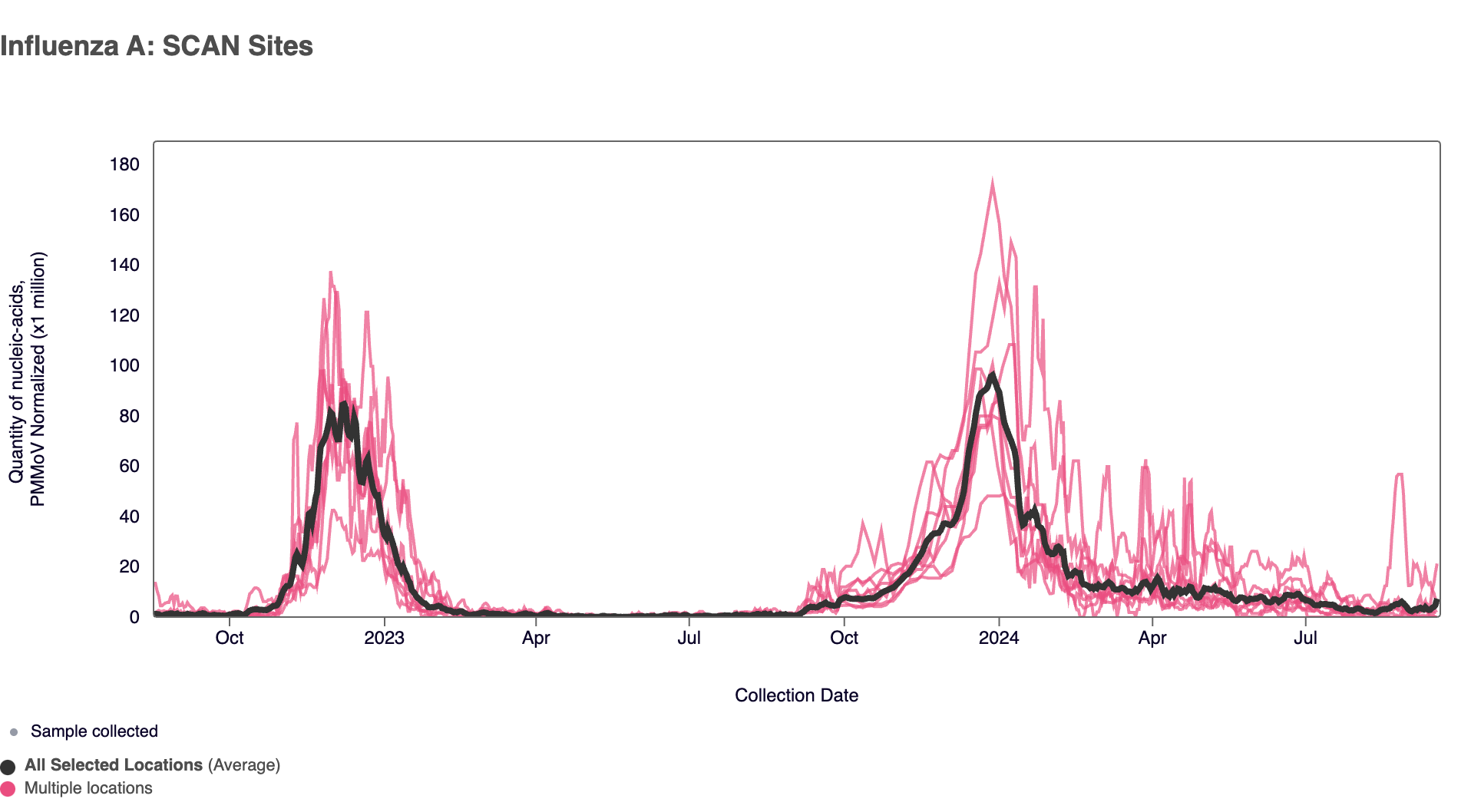 Influenza A (IAV) RNA: Below are all the IAV data from all the SCAN plants for the last two years. You can access the graph here. The population weighted average across the SCAN plants is shown in black.