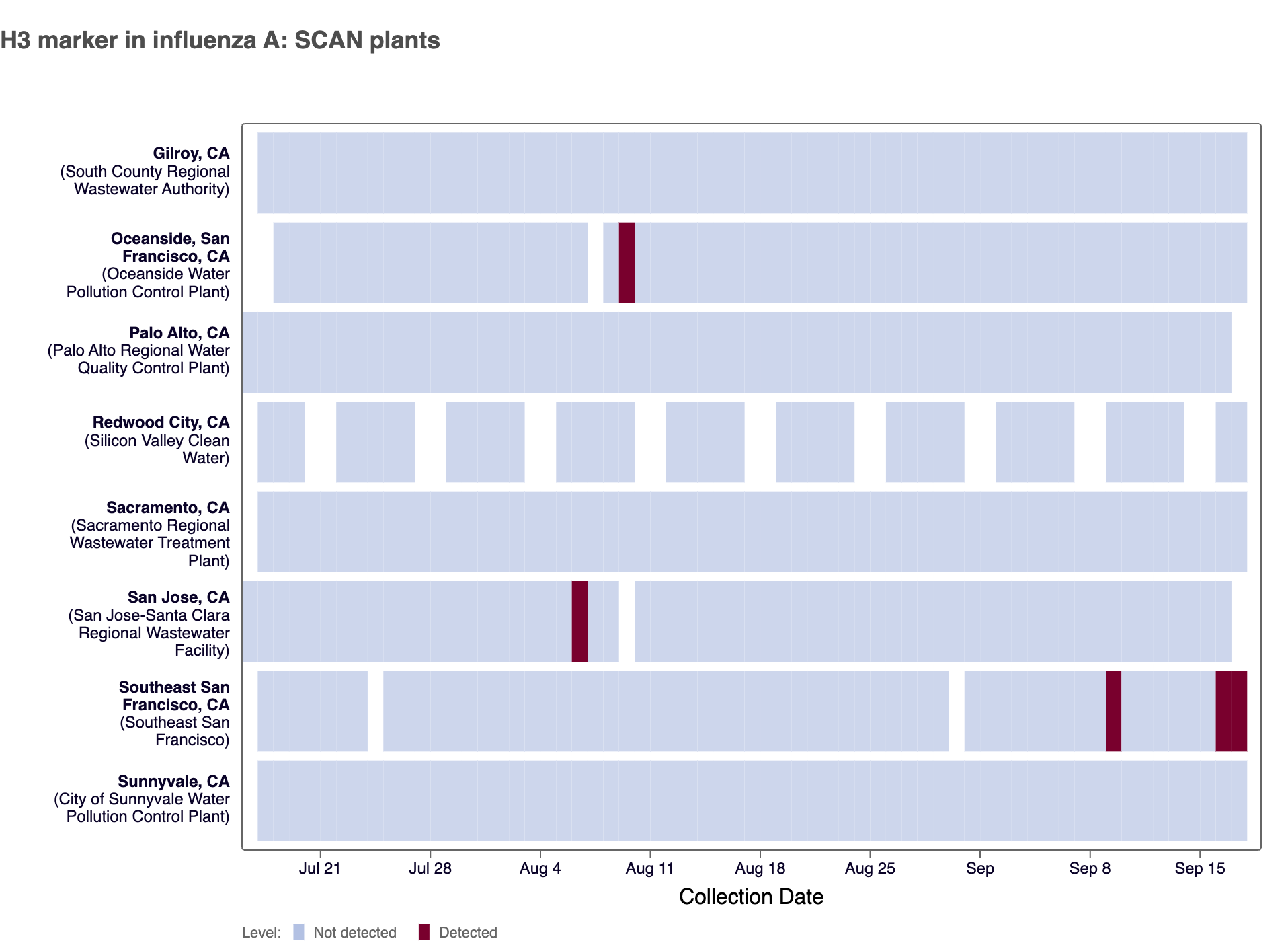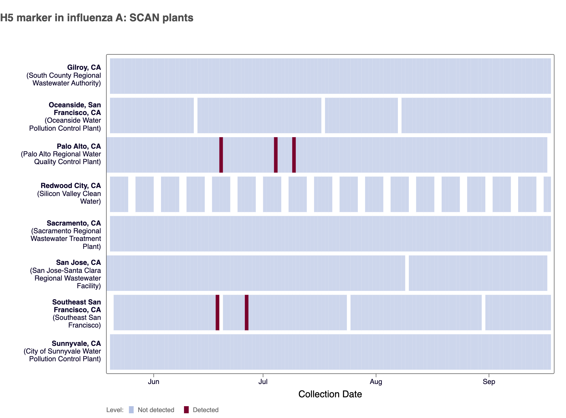2 sites in the SCAN network (Palo Alto and Southeast SF) have tested positive for the H5 marker in influenza A since we began testing for the marker prospectively in May 2024.