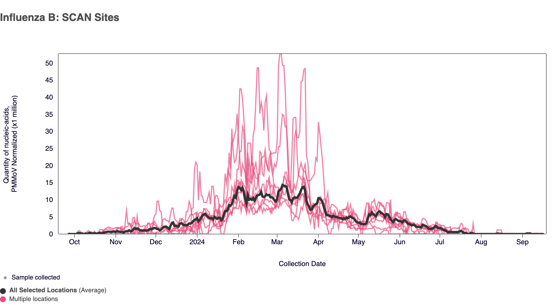 Influenza B (IBV) RNA has rarely been detected in samples collected from SCAN sites in the last 3 weeks. In the chart below (representing data from the past 1 year), the population weighted average across the SCAN plants is shown in black. You can access the graph here.