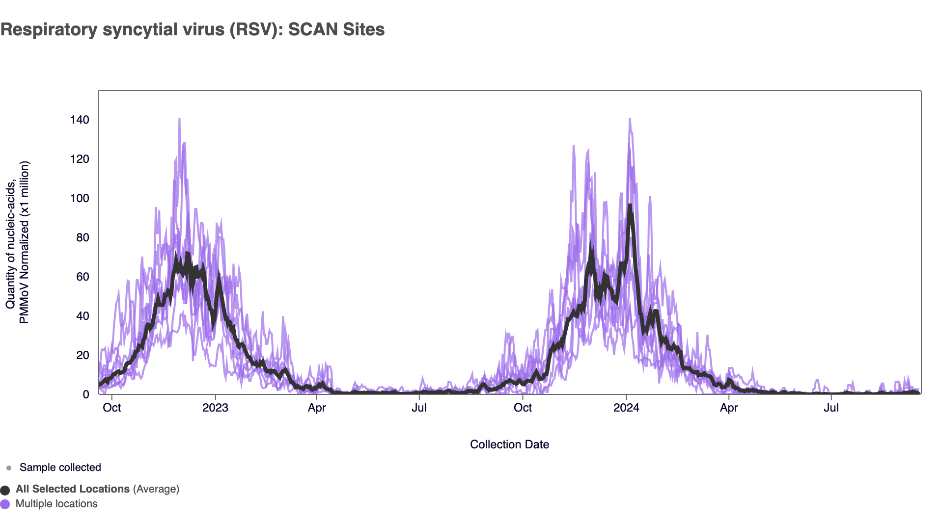 RSV RNA has sporadically been detected in samples collected from SCAN sites in the last 3 weeks. In the chart below (representing data from the past 2 years), the population weighted average line across all the SCAN sites is shown in black, and you can see the current concentrations relative to the peak RSV levels from late last year. The link to the chart below is here if you would like to interact with it.
