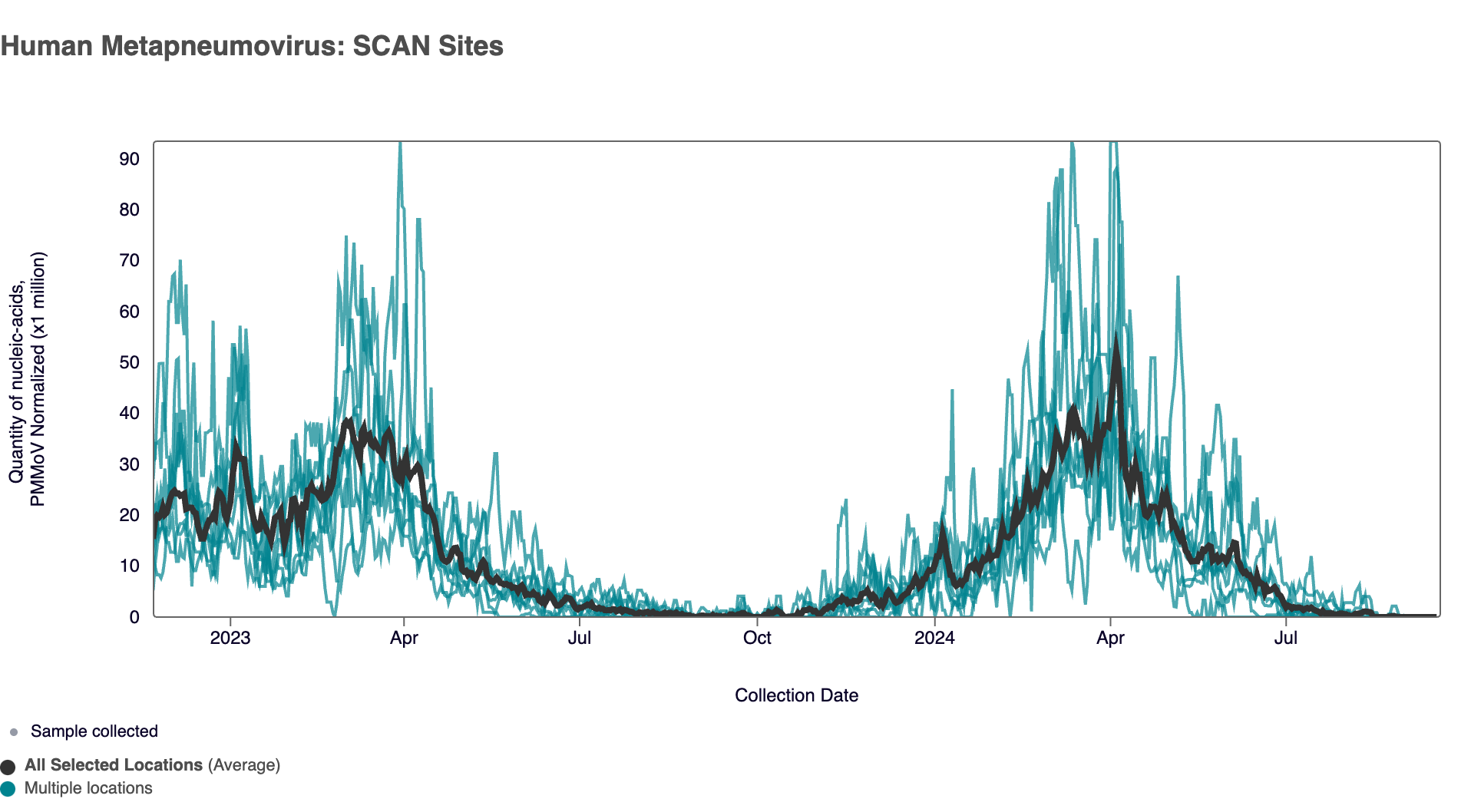 In the chart below, the population weighted average line across all the SCAN plants is shown in black (link here to this chart if you want to interact with it) since December 2022. Evident in the chart are the very low HMPV concentrations across all SCAN sites.