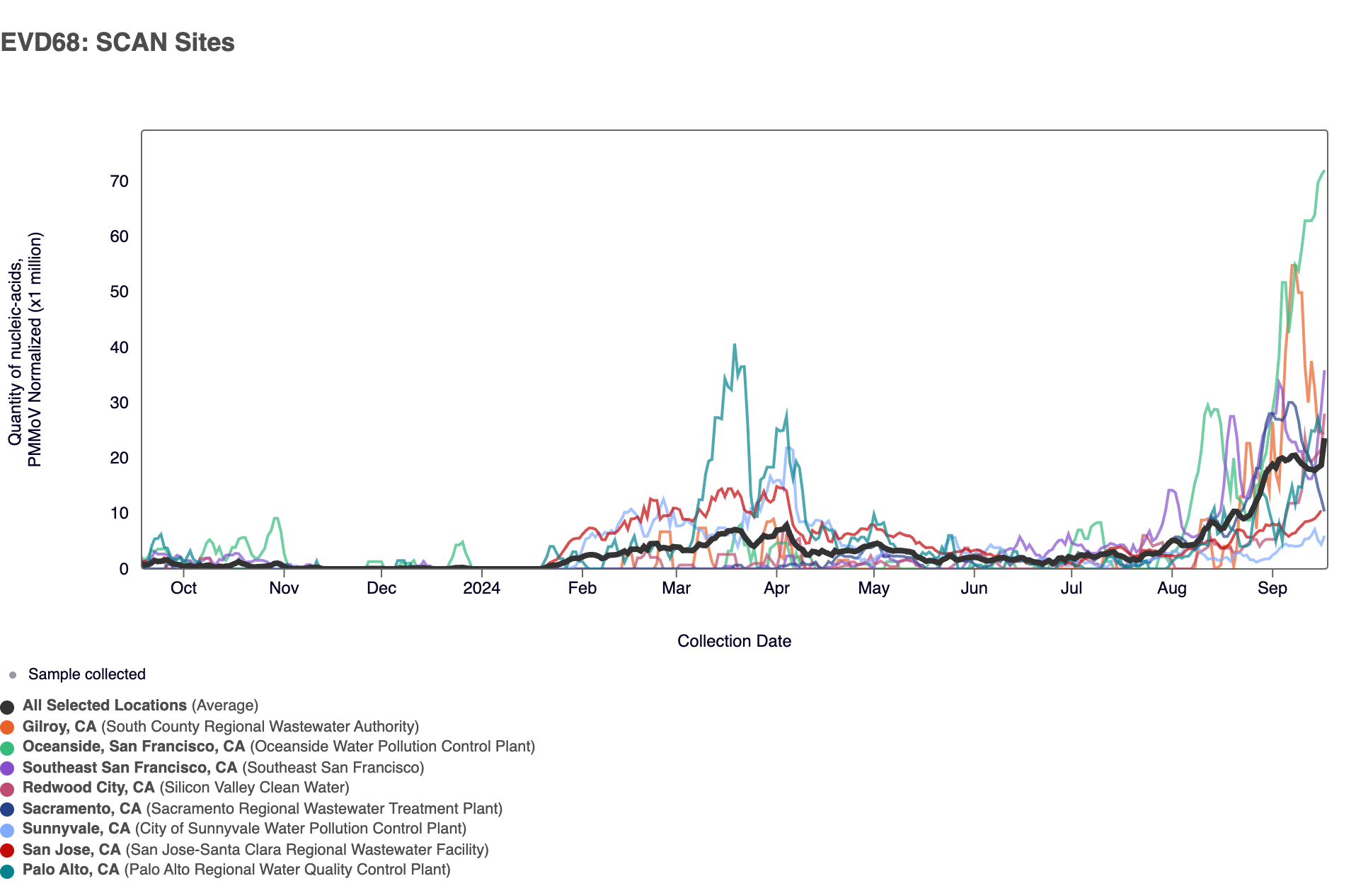 In the chart below, the population weighted average line across all the SCAN plants is shown in black over the last 12 months. Evident in the chart are increasing EV-D68 concentrations since early August 2024. This mirrors what were are seeing across the national WWSCAN sites.