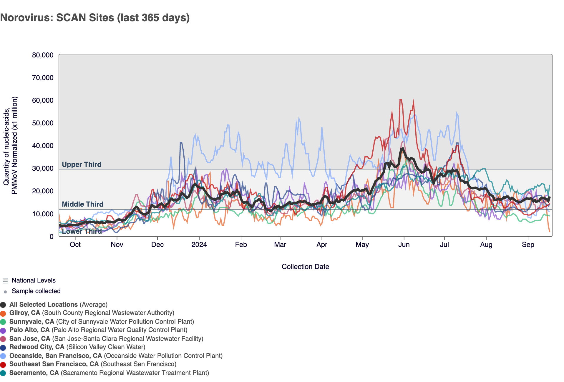 - Palo Alto, Sacramento, San Jose, and SVCW are in the MEDIUM Wastewater Category for Norovirus