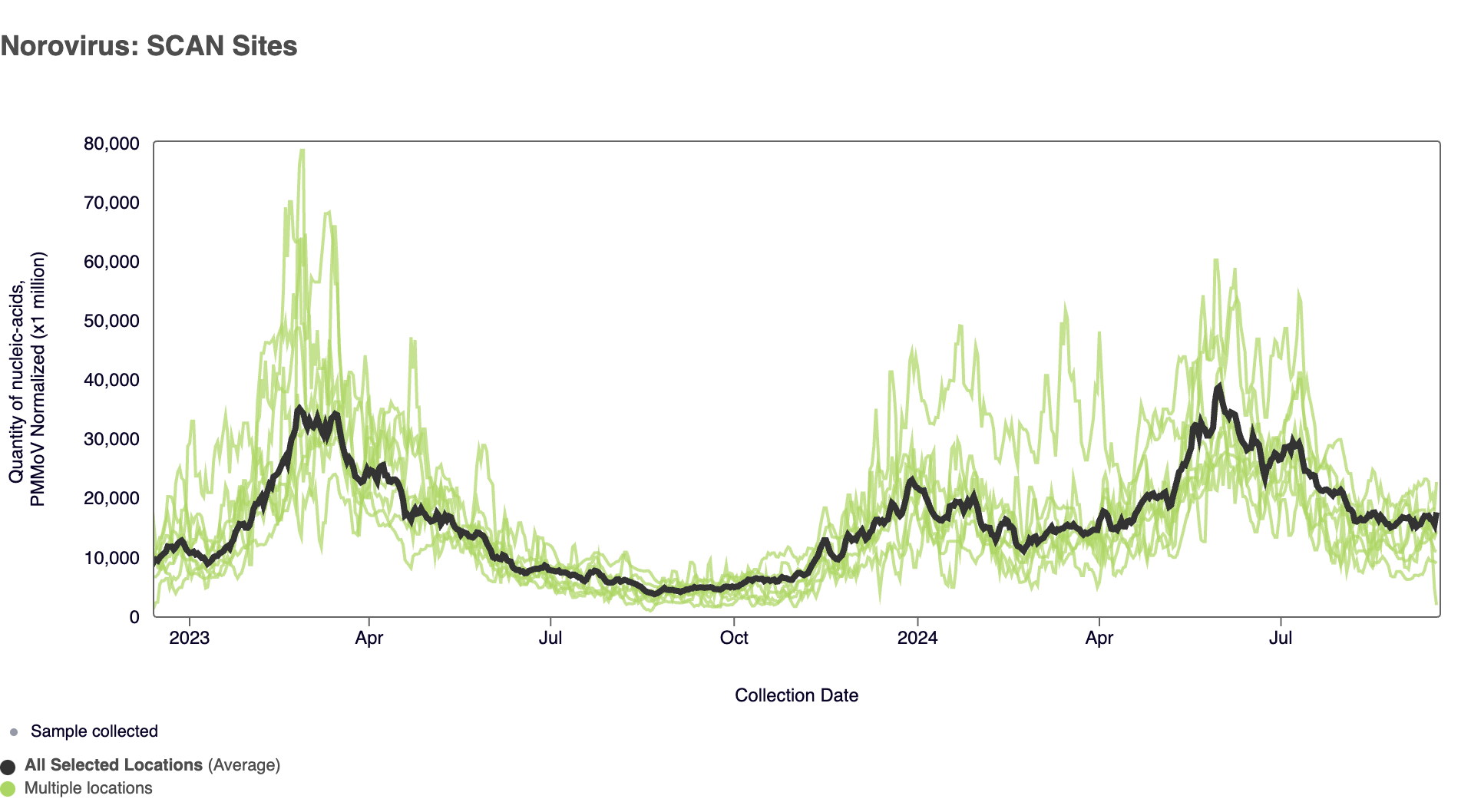 The plot below shows the Norovirus concentrations at the SCAN sites since we began monitoring in late 2022. The population weighted average line is shown in black. You can interact with the chart of all the plants at this link.