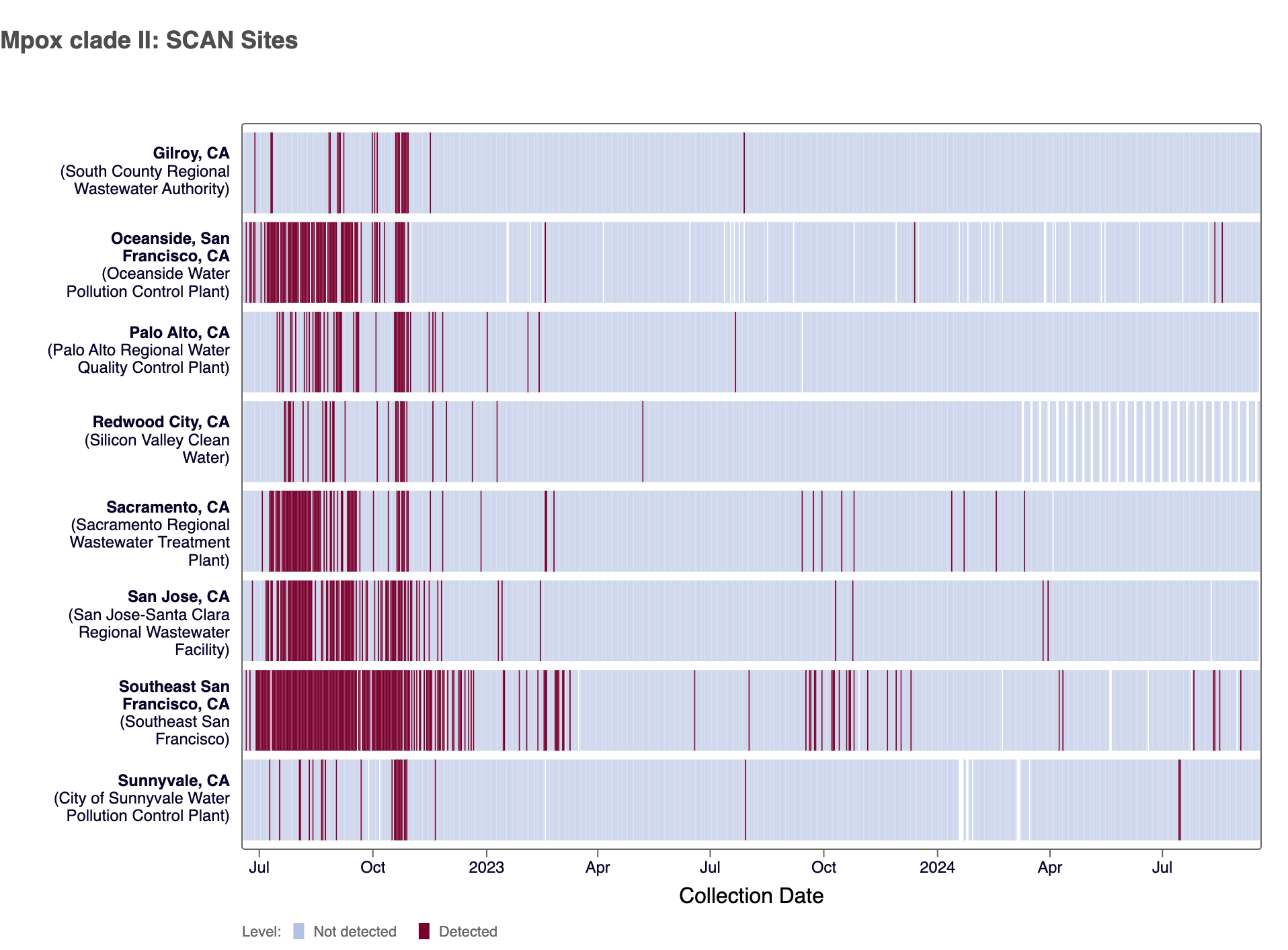 The heat map below shows all the SCAN sites as a row, and each date as a column since July 2022. The color blue means that Mpox clade II DNA was not detected in the sample, and the dark red color means it was detected. White indicates no sample was collected. The chart shows all the data we have collected. You can access the chart here.