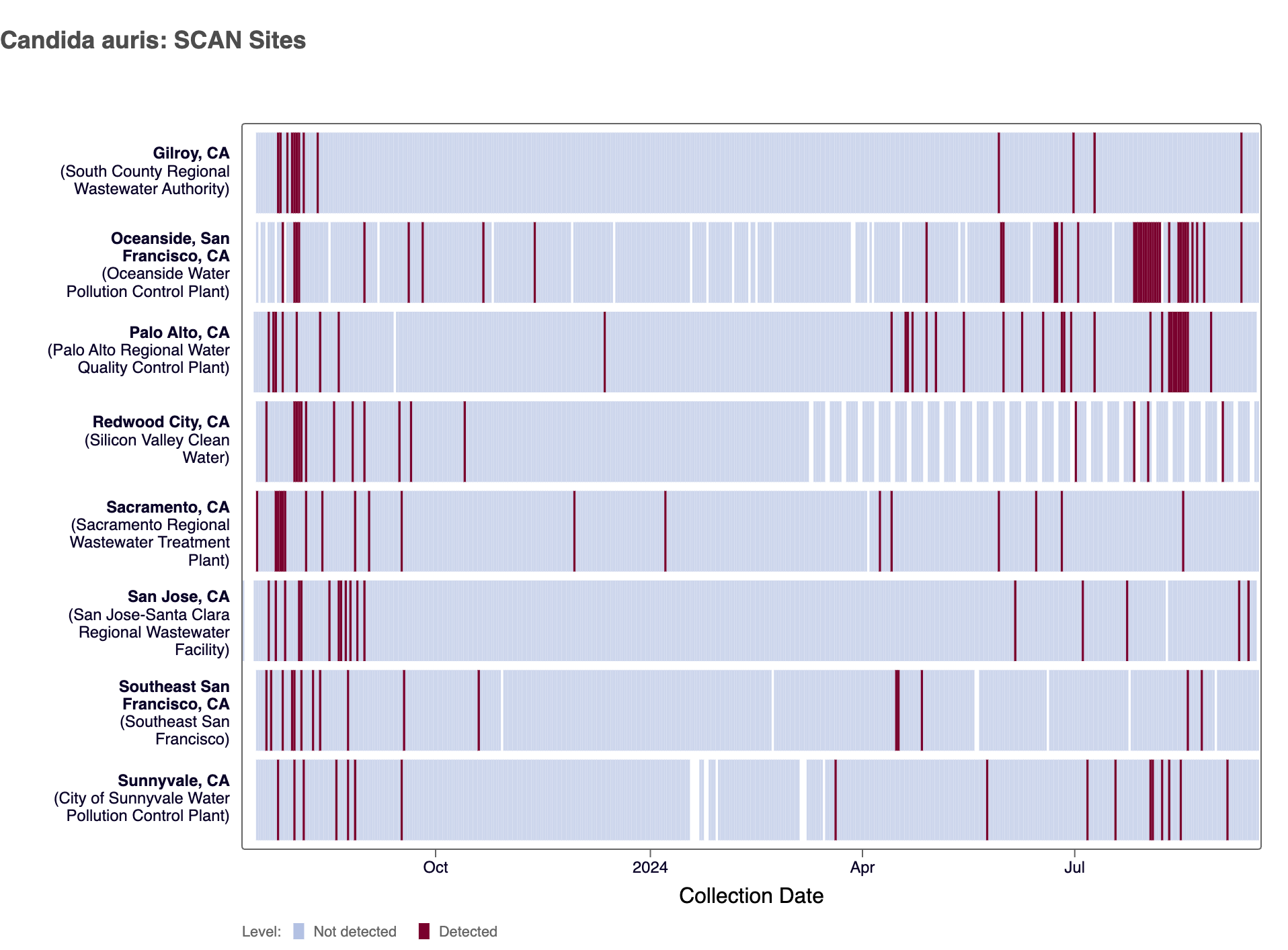 Candida auris DNA was detected at six of the SCAN sites in the last 3 weeks (Gilroy, Oceanside SF, Palo Alto, SVCW, San Jose and Sunnyvale).
